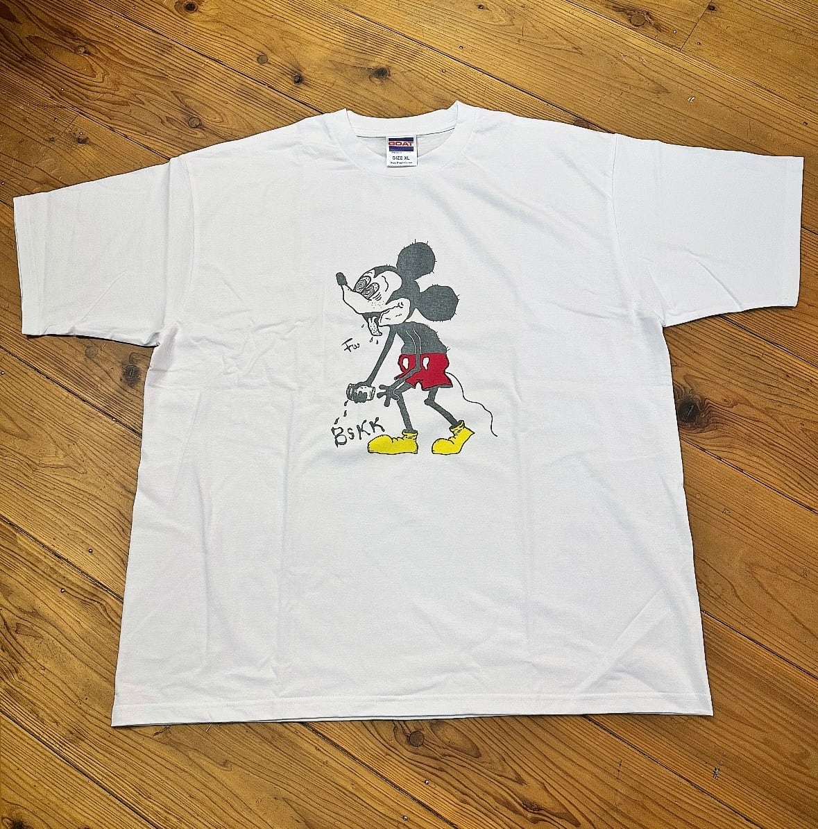 生地に染み込んでいくインクを使ったプリントになります。洗っていくとプリントの風合いが薄れていき古着感が出てくると思います。