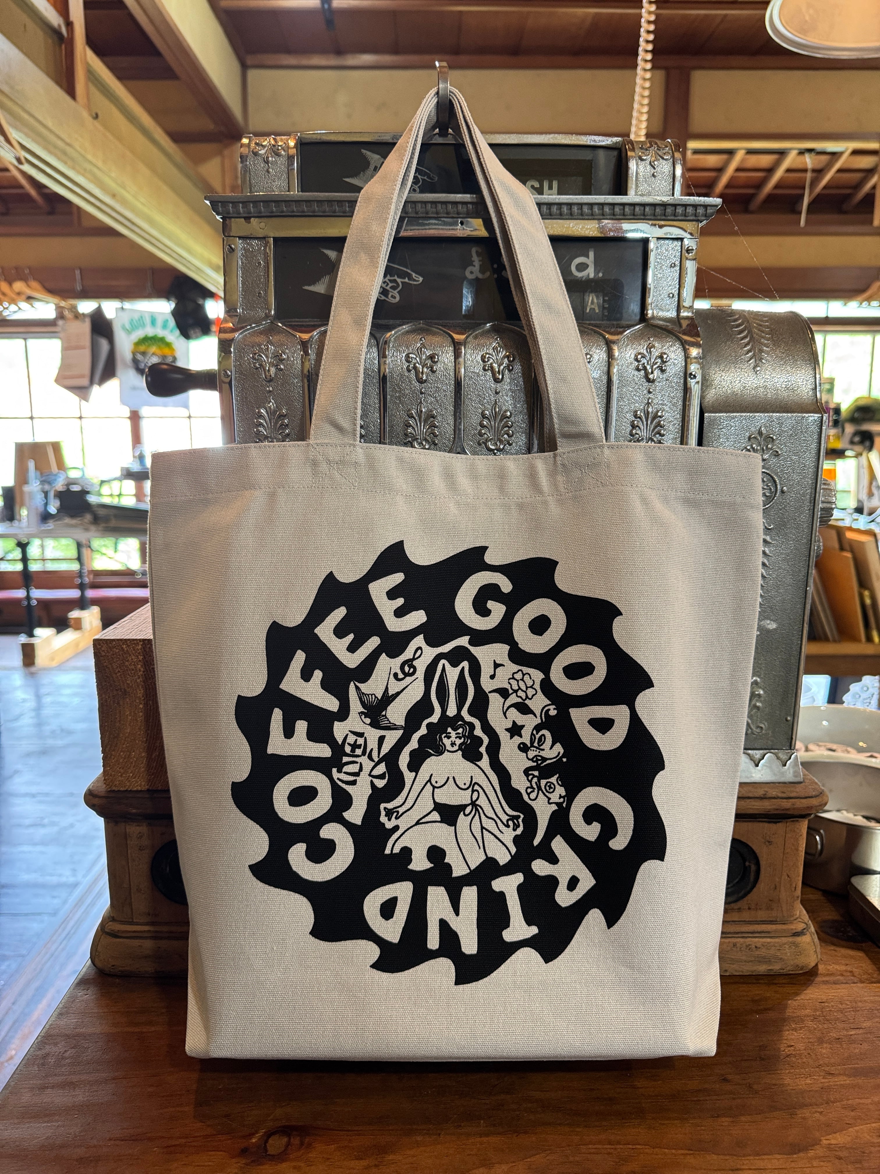 GOODGRIND COFFEEから厚手のキャンパス生地のトートバックが登場です。 使い勝手の良い底マチあり、内ポケットありの秀逸バッグ。 サイズ:縦34cm横38cm底マチ10cm カラー:ライトグレー プリントカラー:BLACK(染み込み) ※ハンドシルクスクリーンプリントの為 掠れや欠け等がある場合がございます。 ※レターパックプラスでの発送になります。