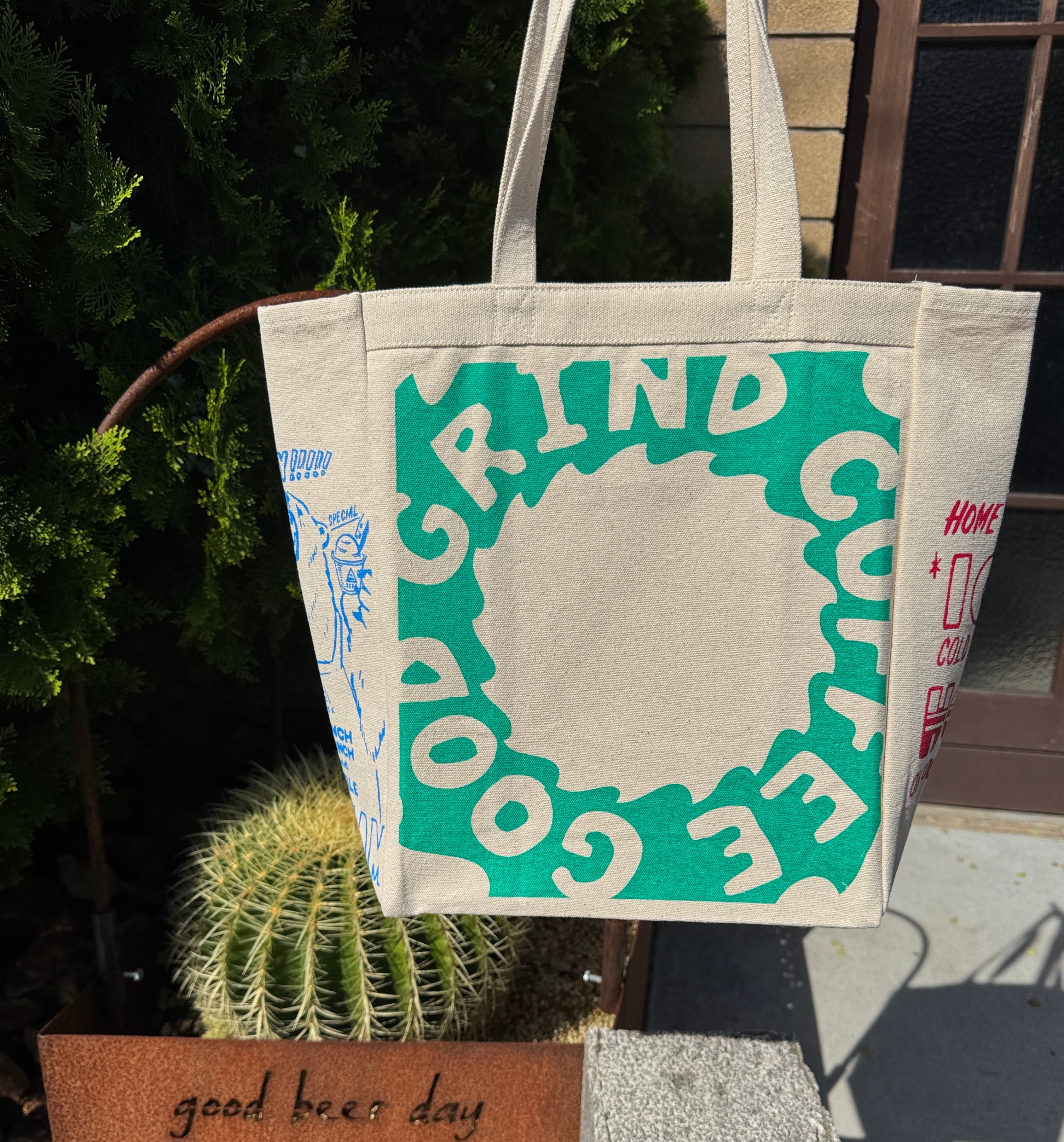 INSTA DMにしか登場しなかったTOTEが何かのミスでWEB SHOPに登場です。 GGCバージョンに何故がGOOD DAYのミスプリント。 一点物。この機会に是非。 トートバック 縦33cm 横26cm マチ14cm 内ポケット2個付き ボディカラーホワイト ※クッション性の無い簡易包装にて発送です。 ※水性ハンドプリントのため、滲み、掠れがございます。 発送:レターパックプラス