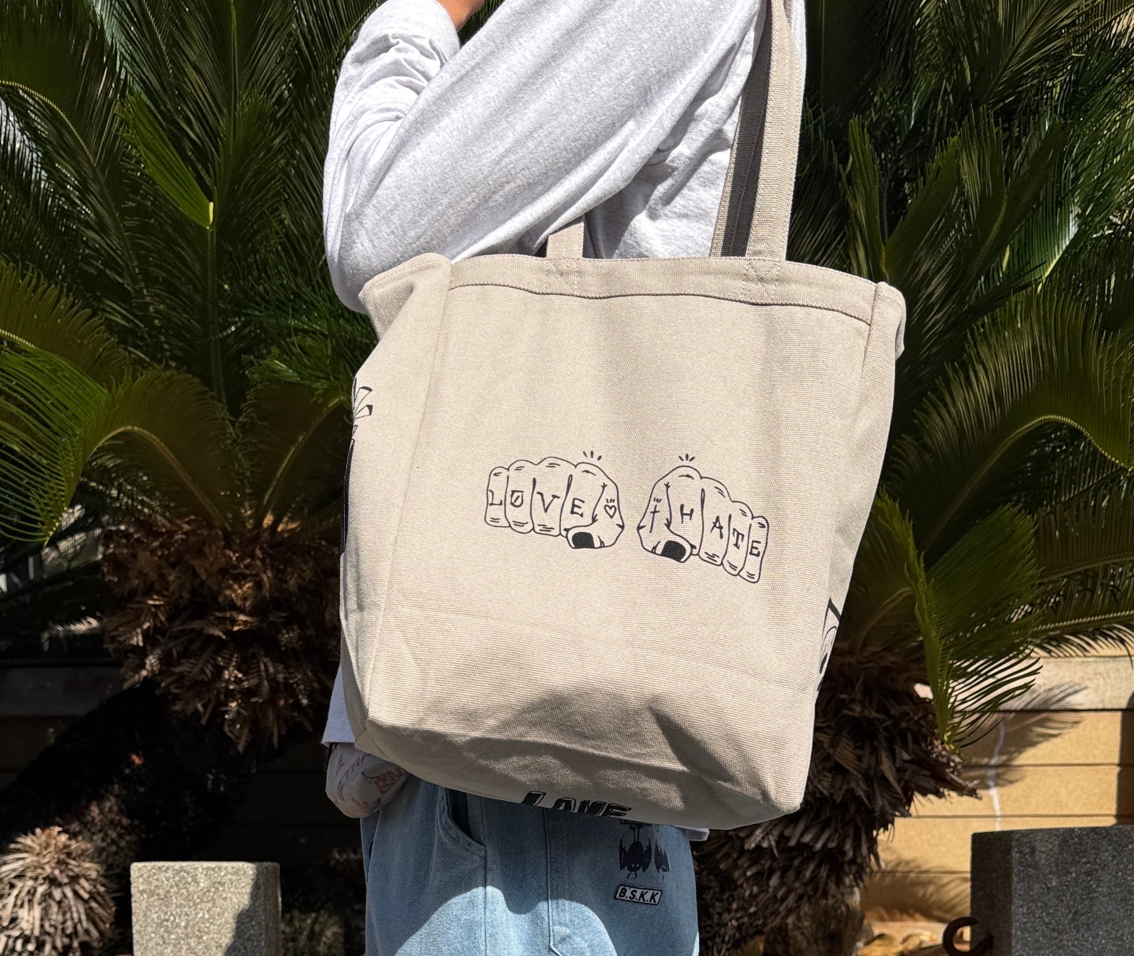 厚手のキャンバストートバック 縦33cm 横26cm マチ14cm 内ポケット2個付き ボディカラー GRAY ※クッション性の無い簡易包装にて発送です。 ※水性ハンドプリントのため、滲み、掠れがございます。 発送:レターパックプラス
