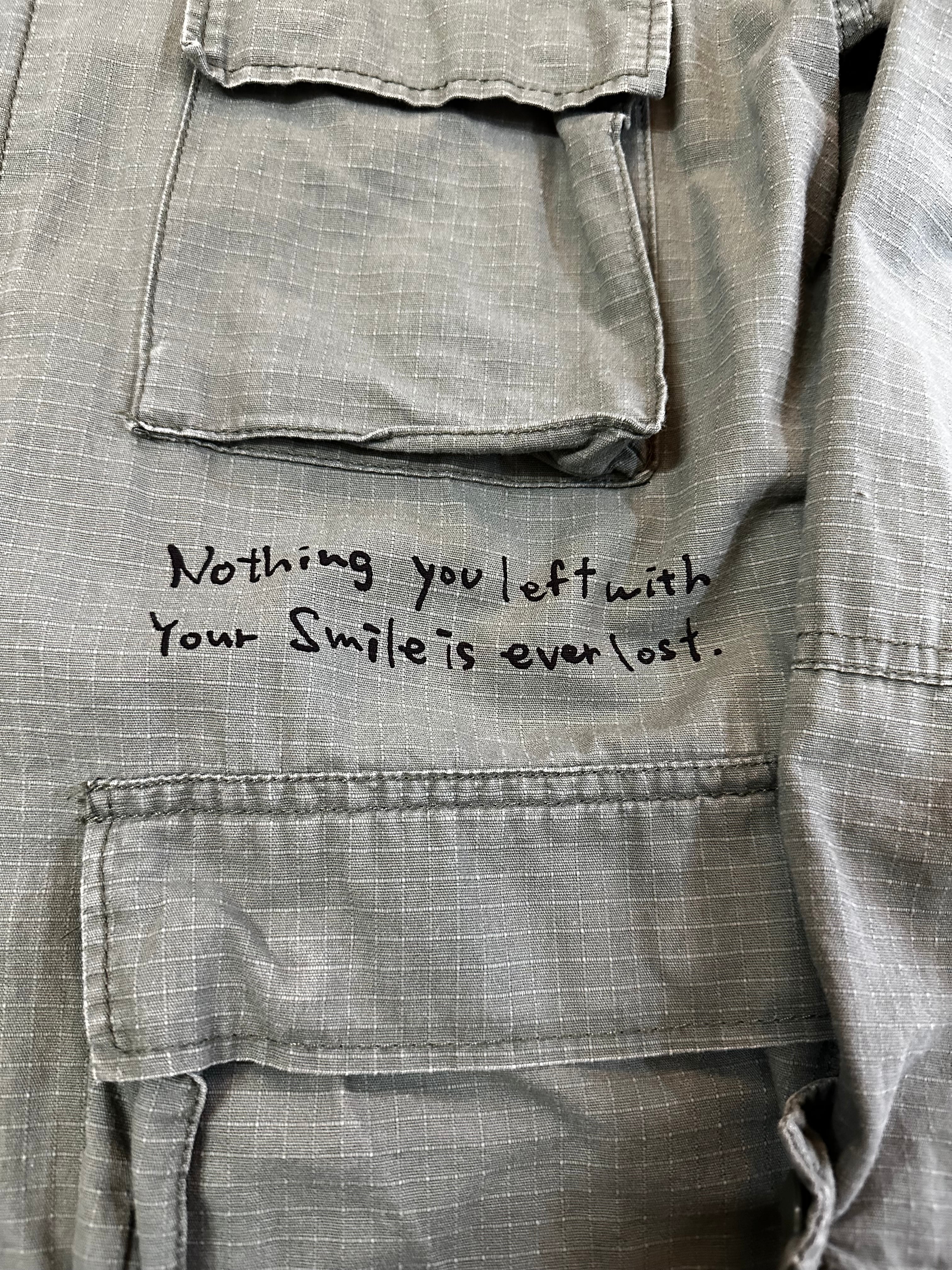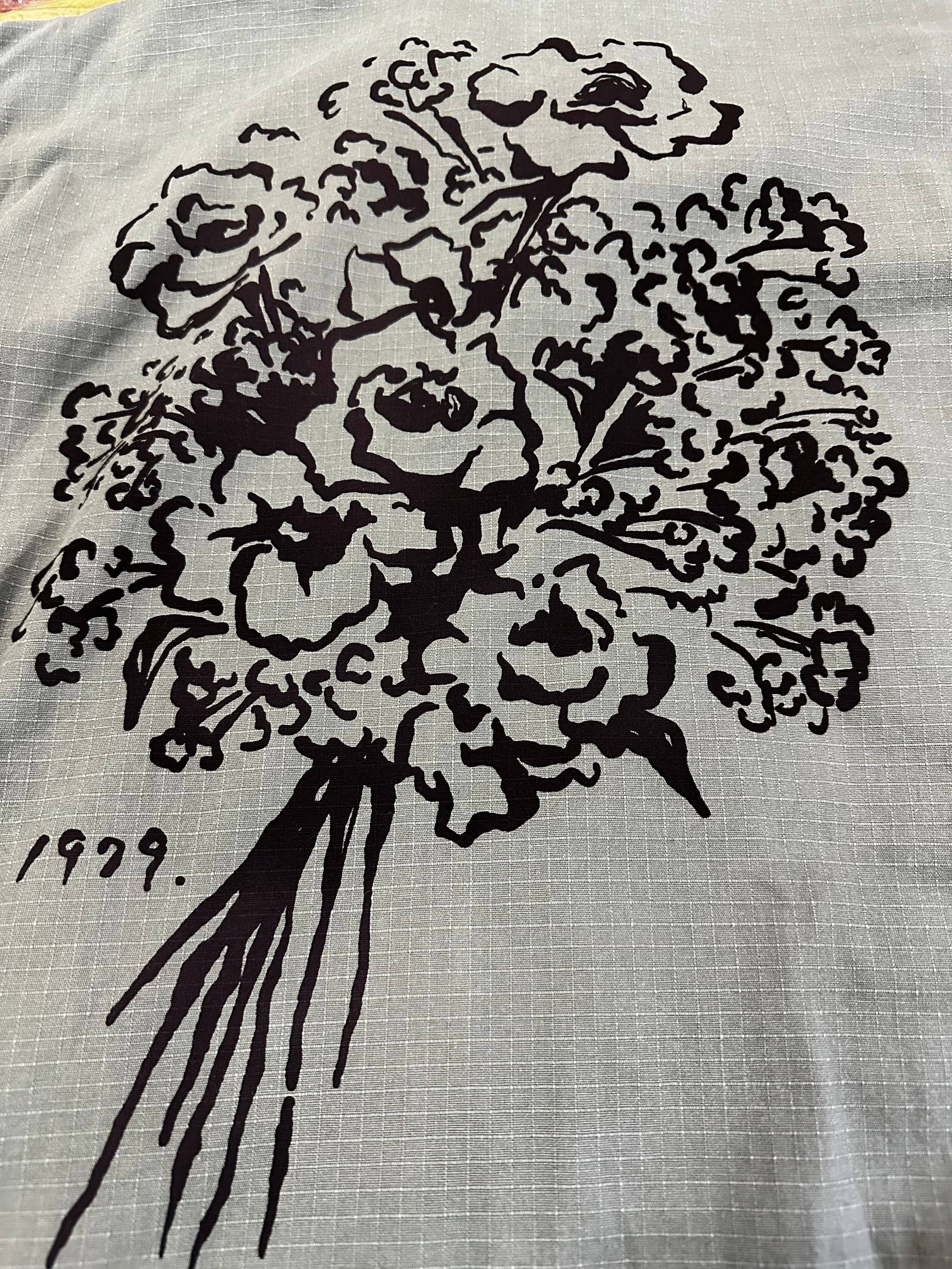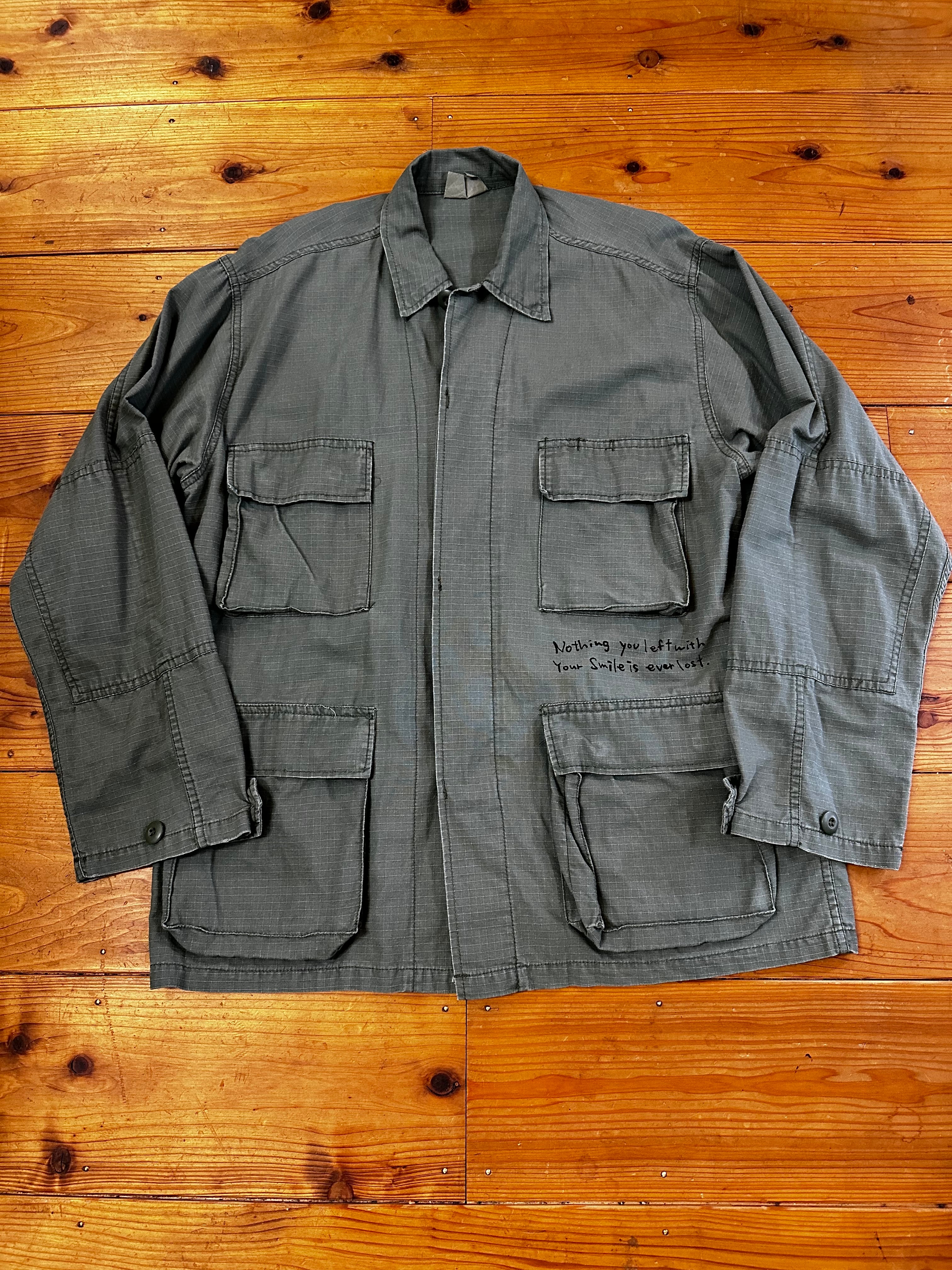 MILITAYのシャツジャケット 染み込みインクを使っているので洗い込んでいけばいい感じに味が出ると思います。 身幅56cm 着丈72cm 古着へプリントしている為、古着にご理解の上でご購入宜しくお願いします。