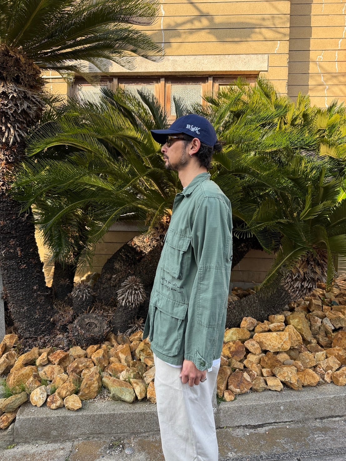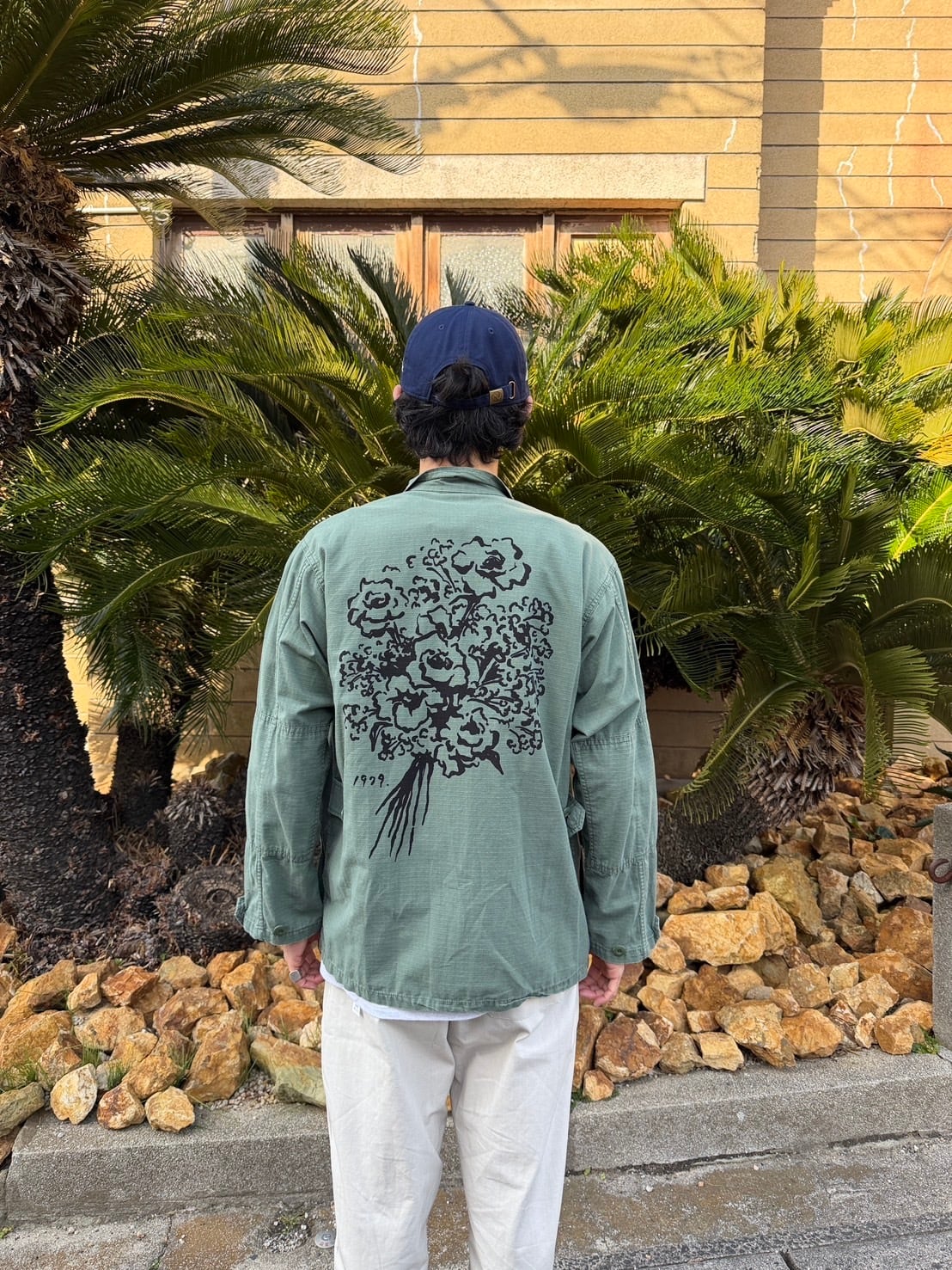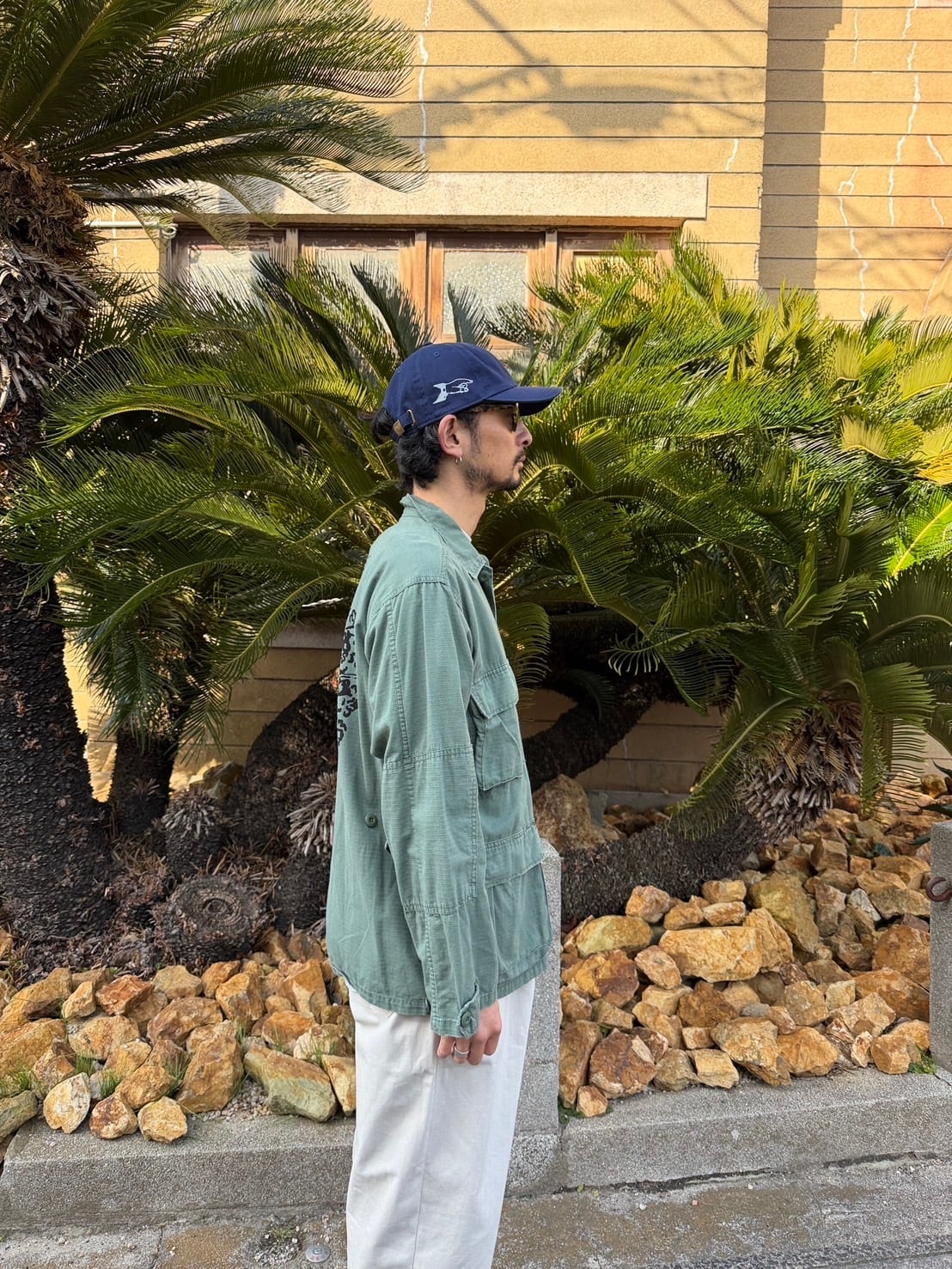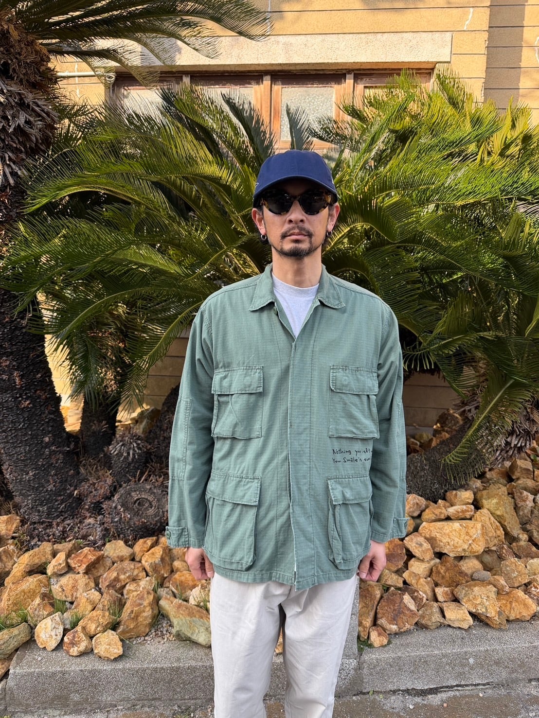 MILITAYのシャツジャケット 染み込みインクを使っているので洗い込んでいけばいい感じに味が出ると思います。 身幅56cm 着丈72cm 古着へプリントしている為、古着にご理解の上でご購入宜しくお願いします。
