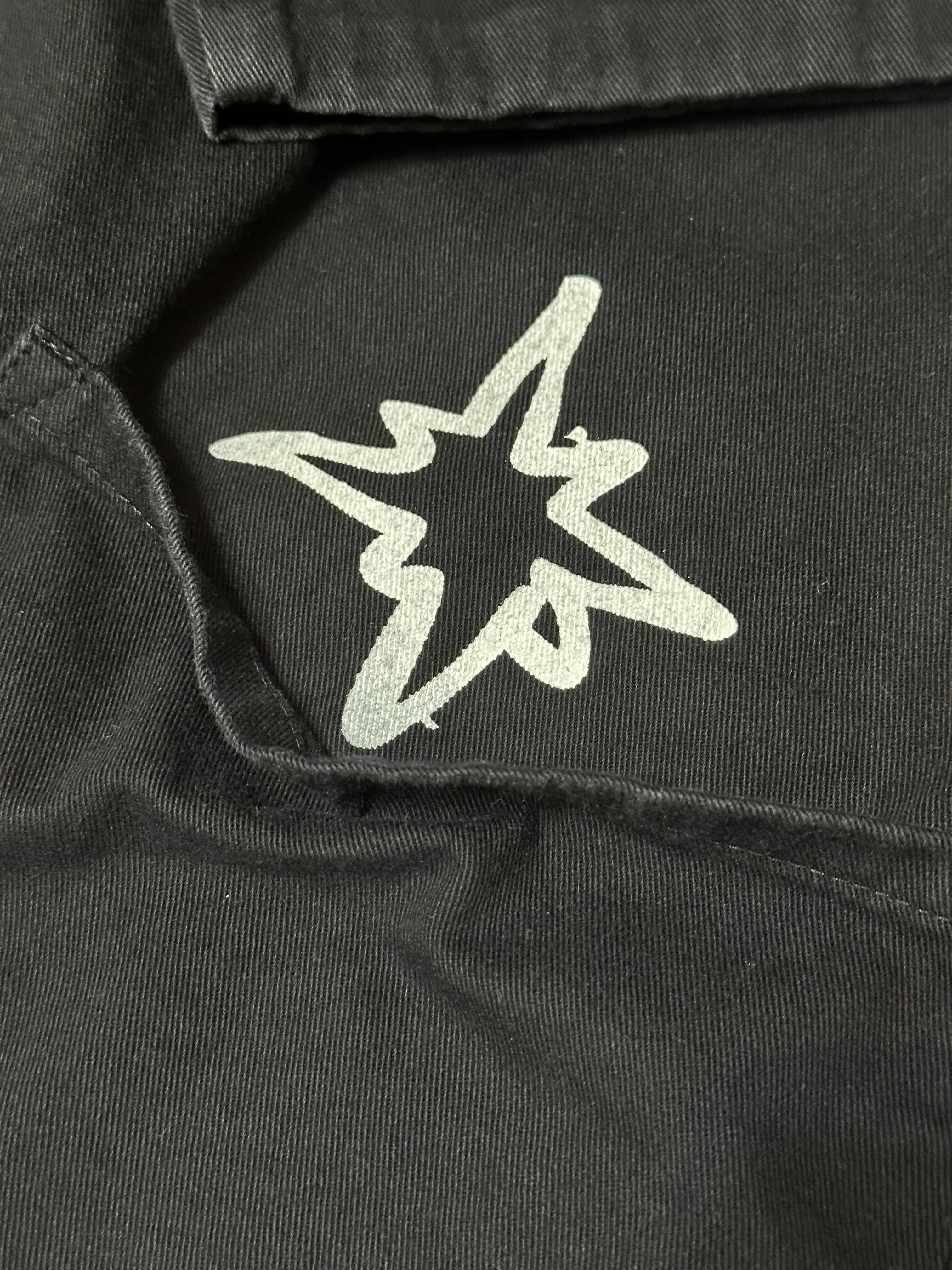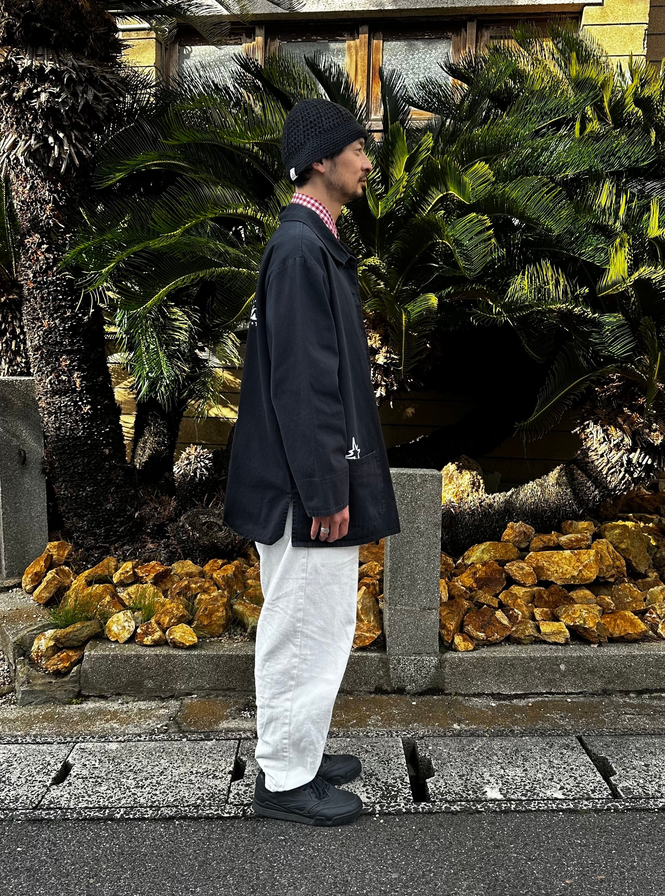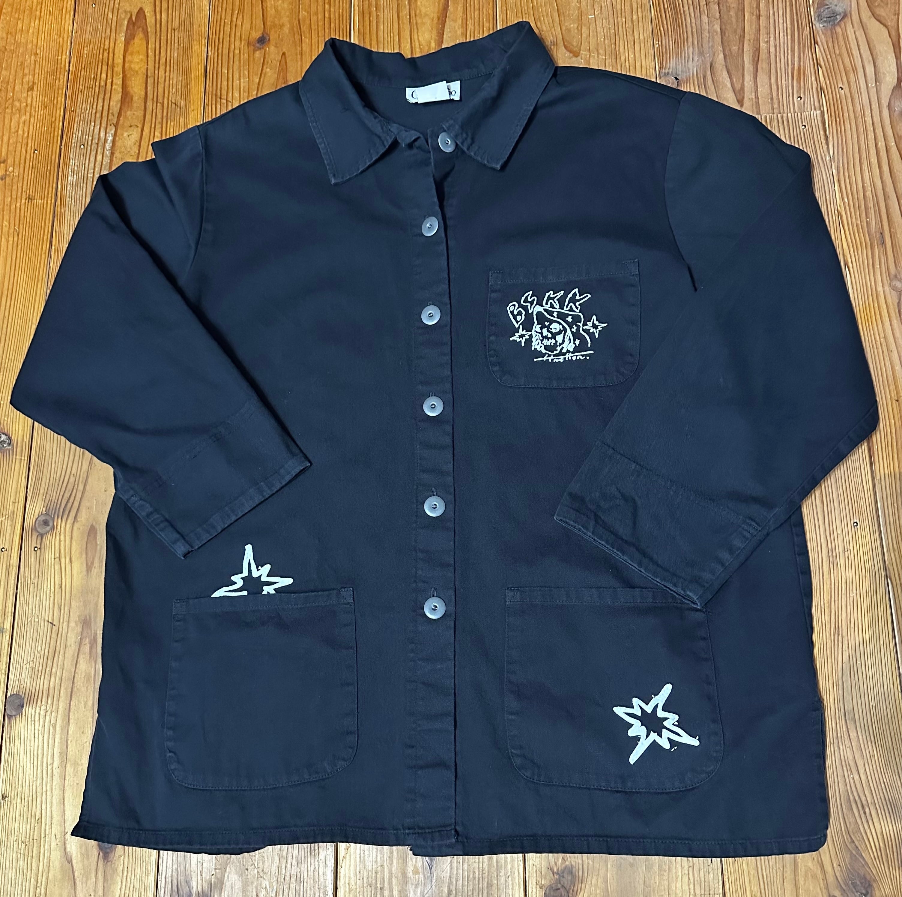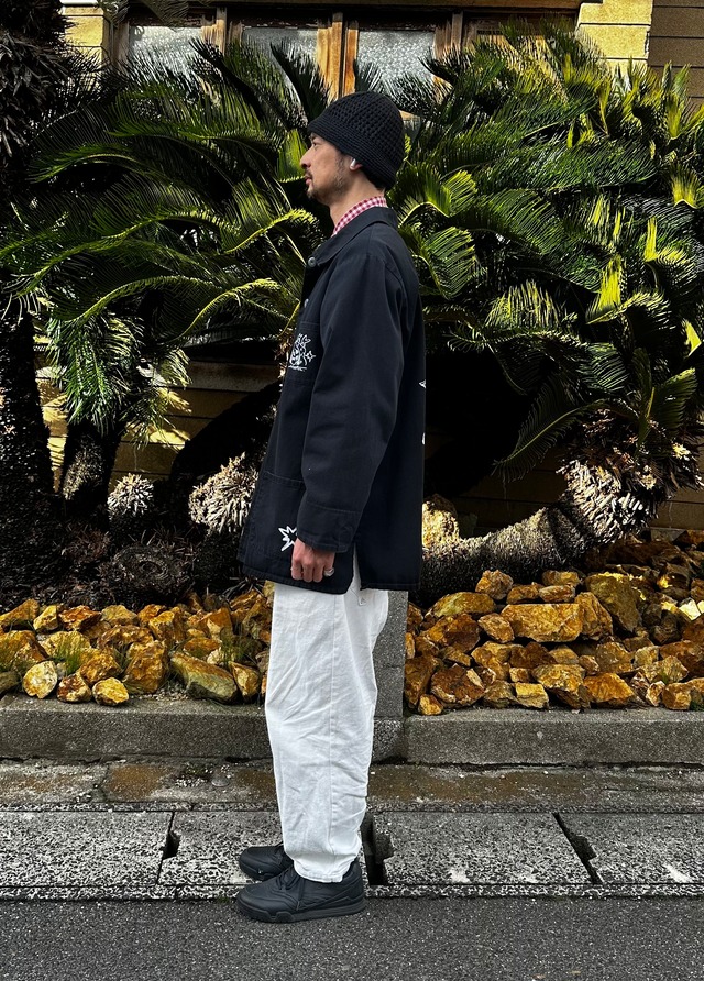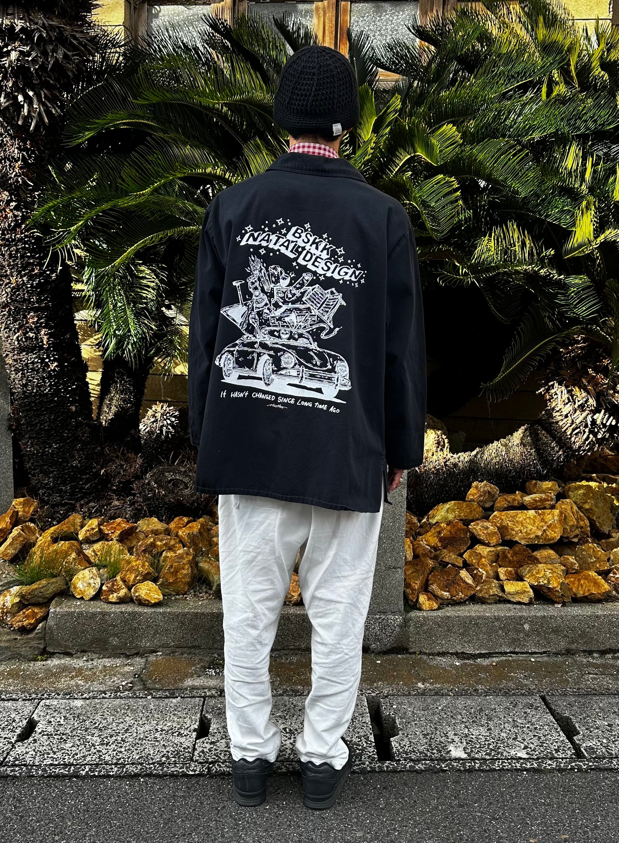 まだ肌寒い時期に脱ぎ着しやすいシャツジャケット! 裏地が付いてないので初夏の夜まで着れると思います。 ボディカラー BLACK プリントカラー WHITE アメリカ製 着丈74cm 身幅65cm 袖丈58cm 肩幅58cm アームホール28cm 全て平置きでのサイズ採算 古着にプリントしてあるため 古着であることをご理解の上でご購入してください。