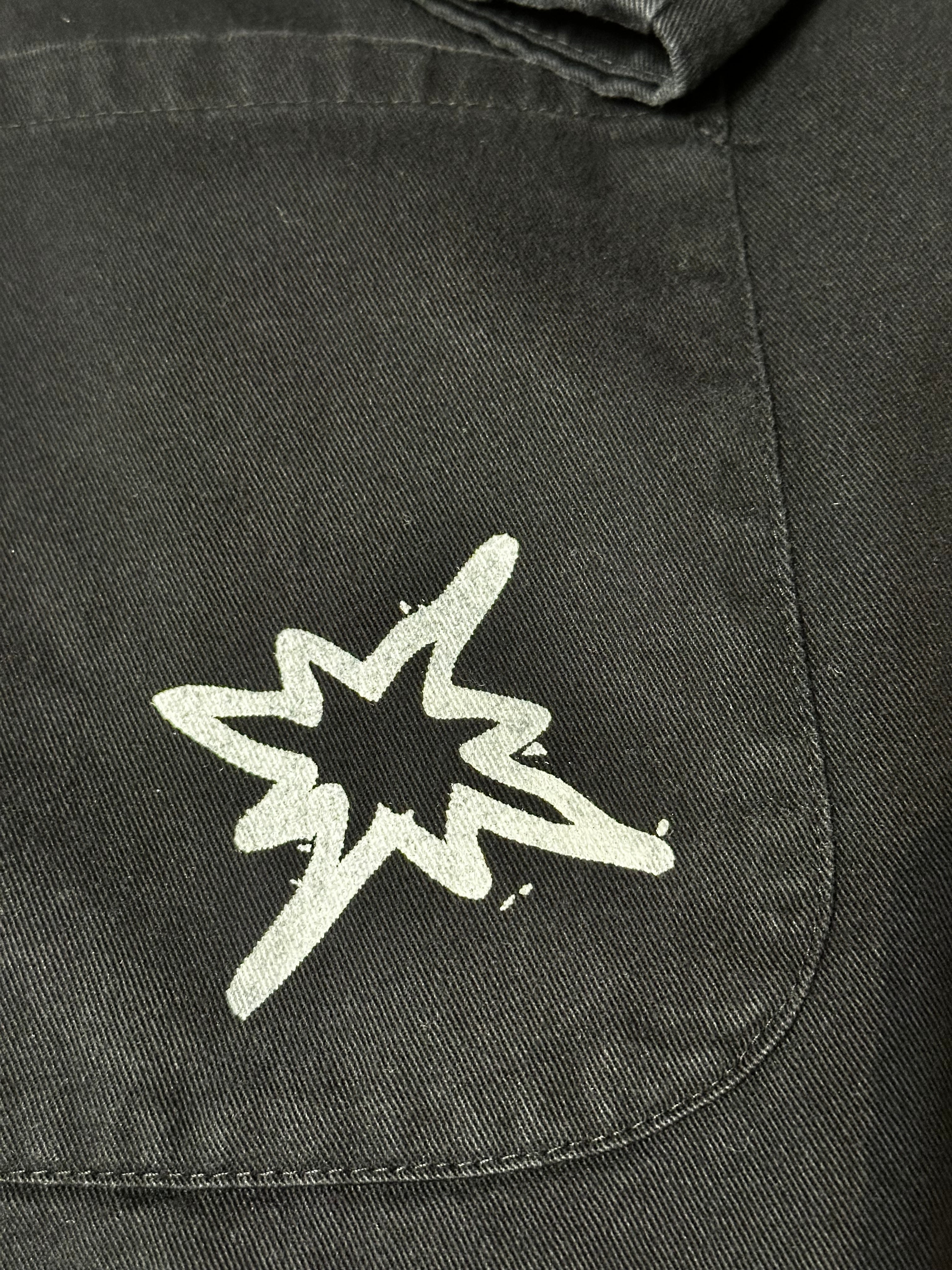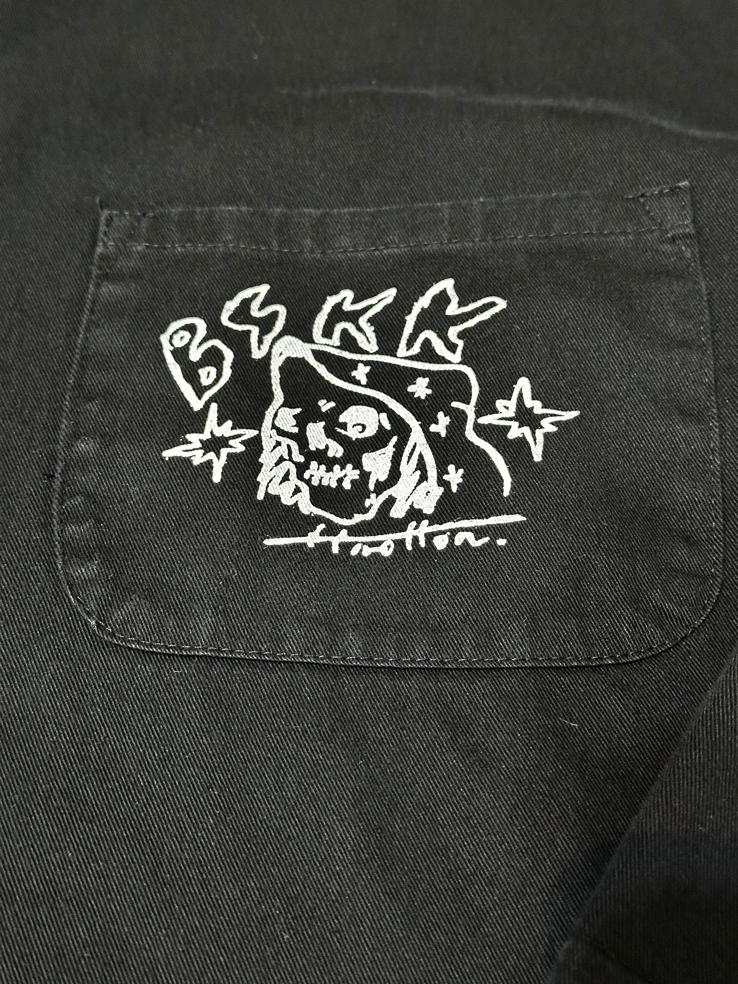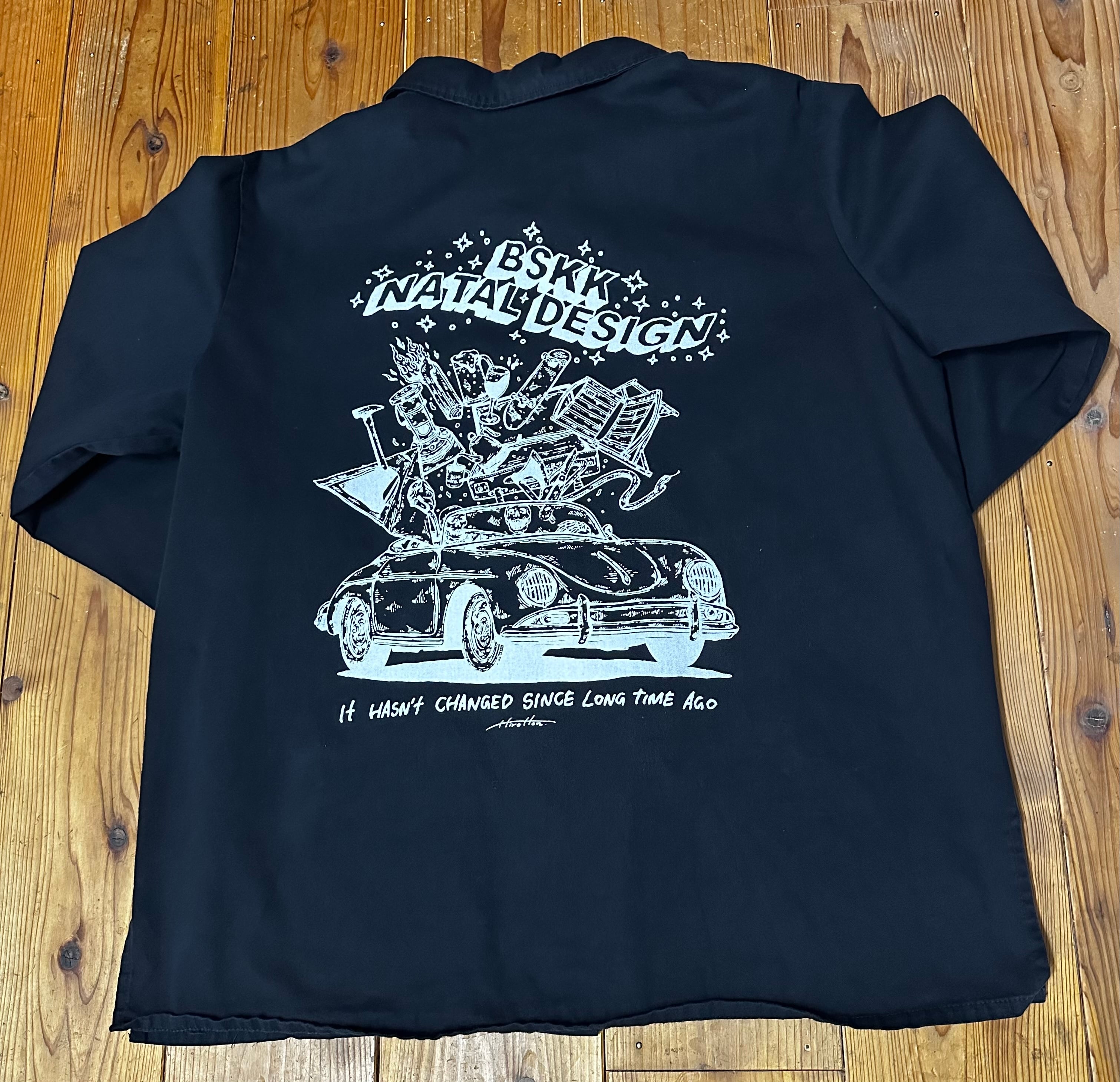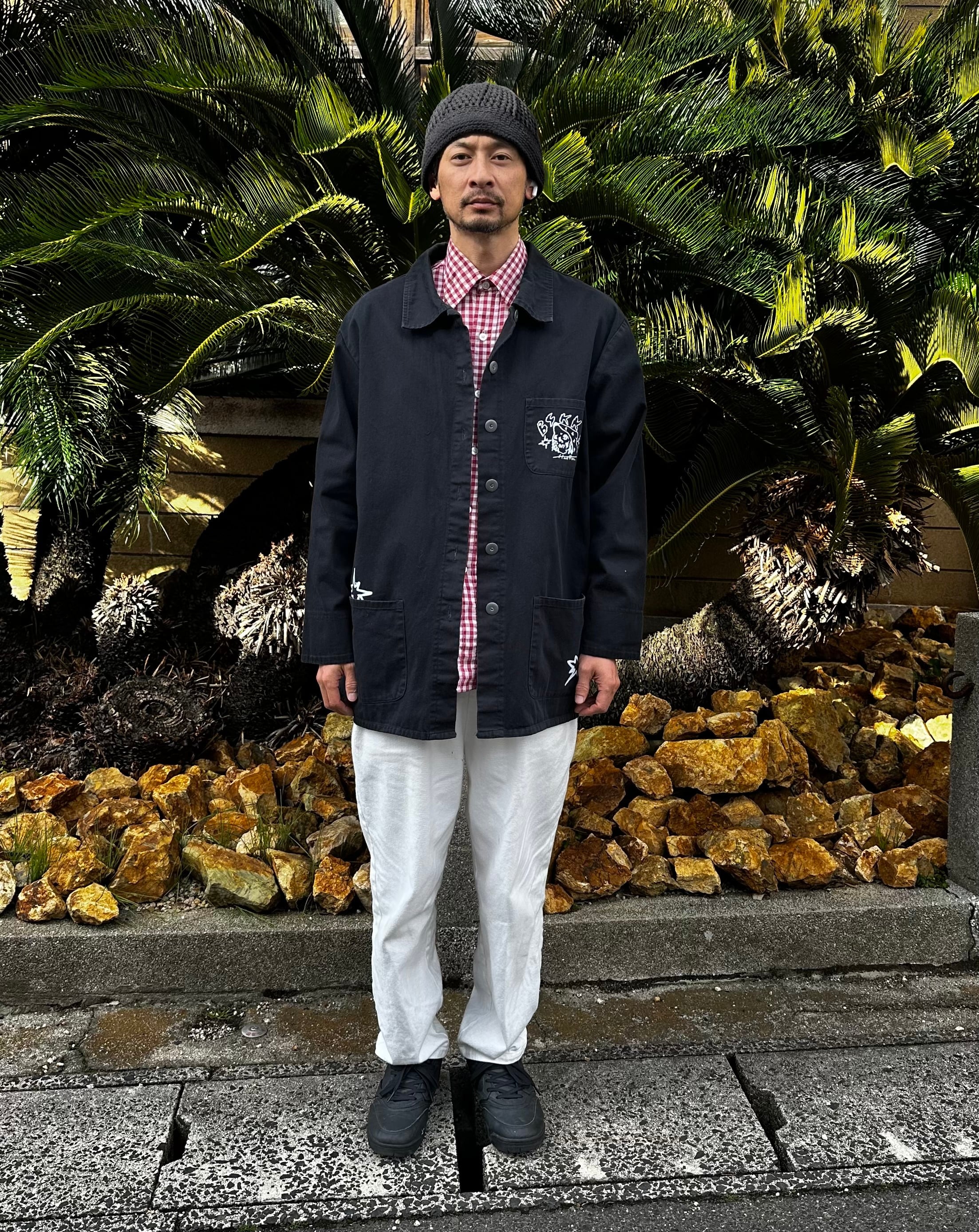 まだ肌寒い時期に脱ぎ着しやすいシャツジャケット! 裏地が付いてないので初夏の夜まで着れると思います。 ボディカラー BLACK プリントカラー WHITE アメリカ製 着丈74cm 身幅65cm 袖丈58cm 肩幅58cm アームホール28cm 全て平置きでのサイズ採算 古着にプリントしてあるため 古着であることをご理解の上でご購入してください。