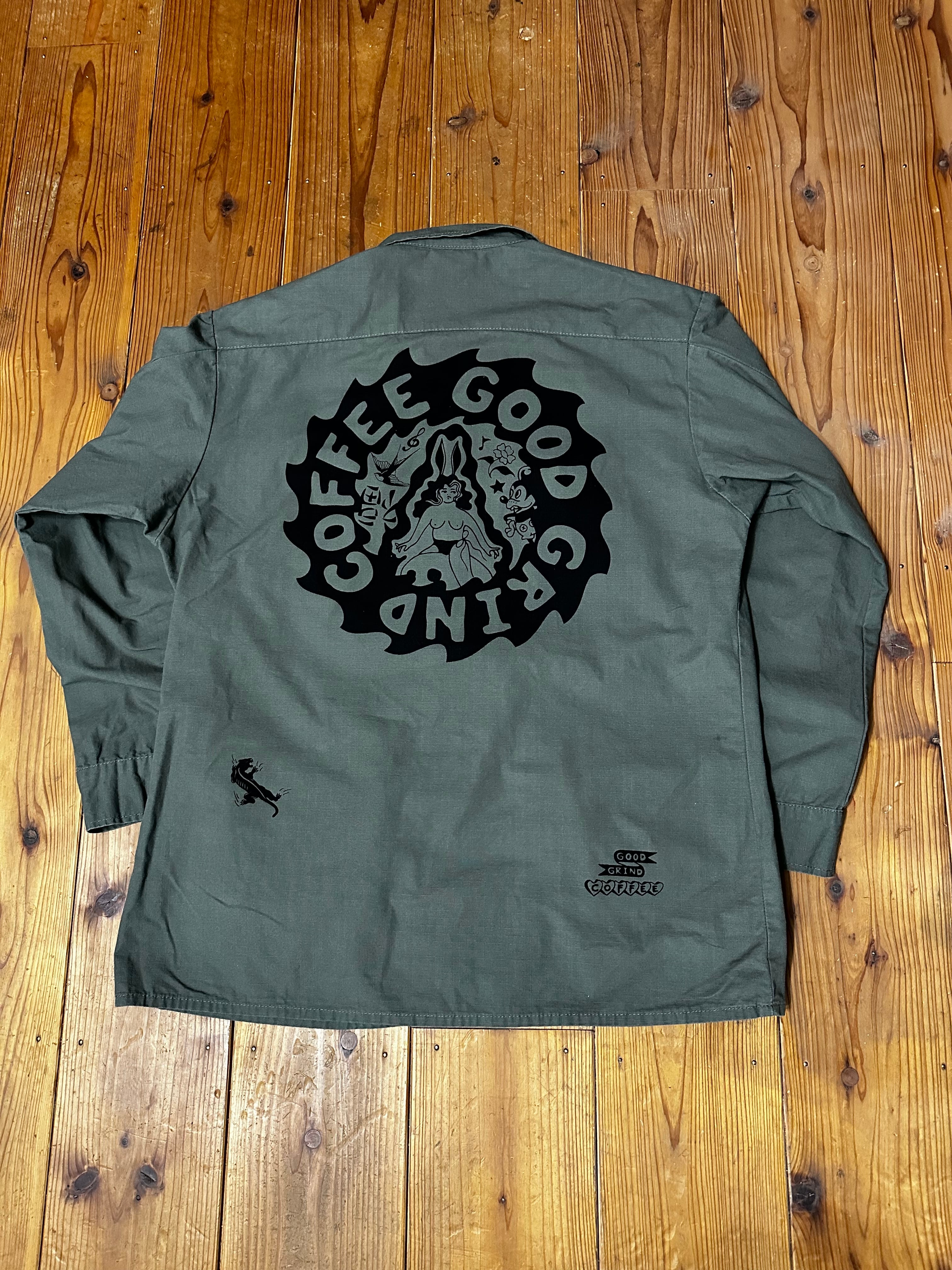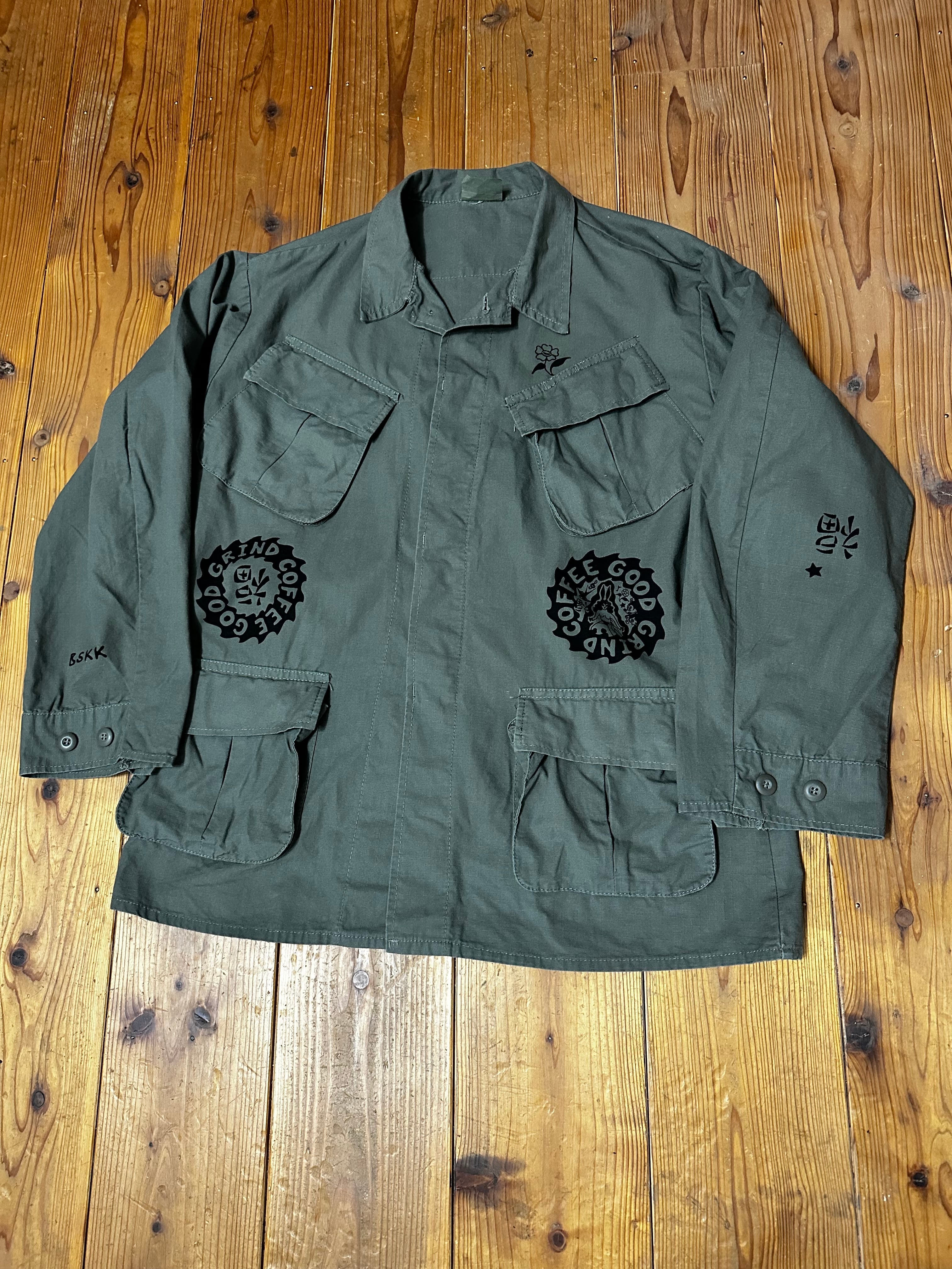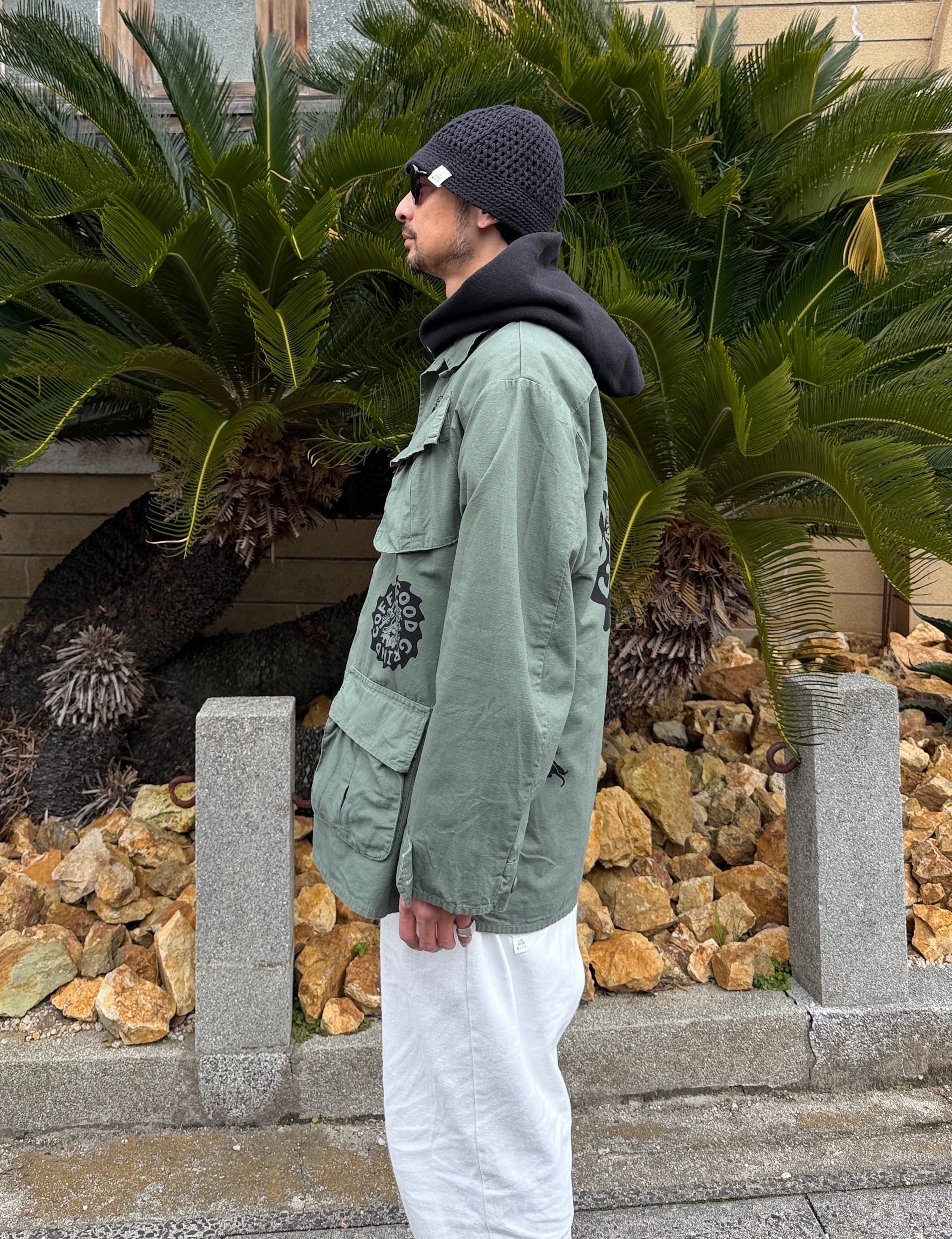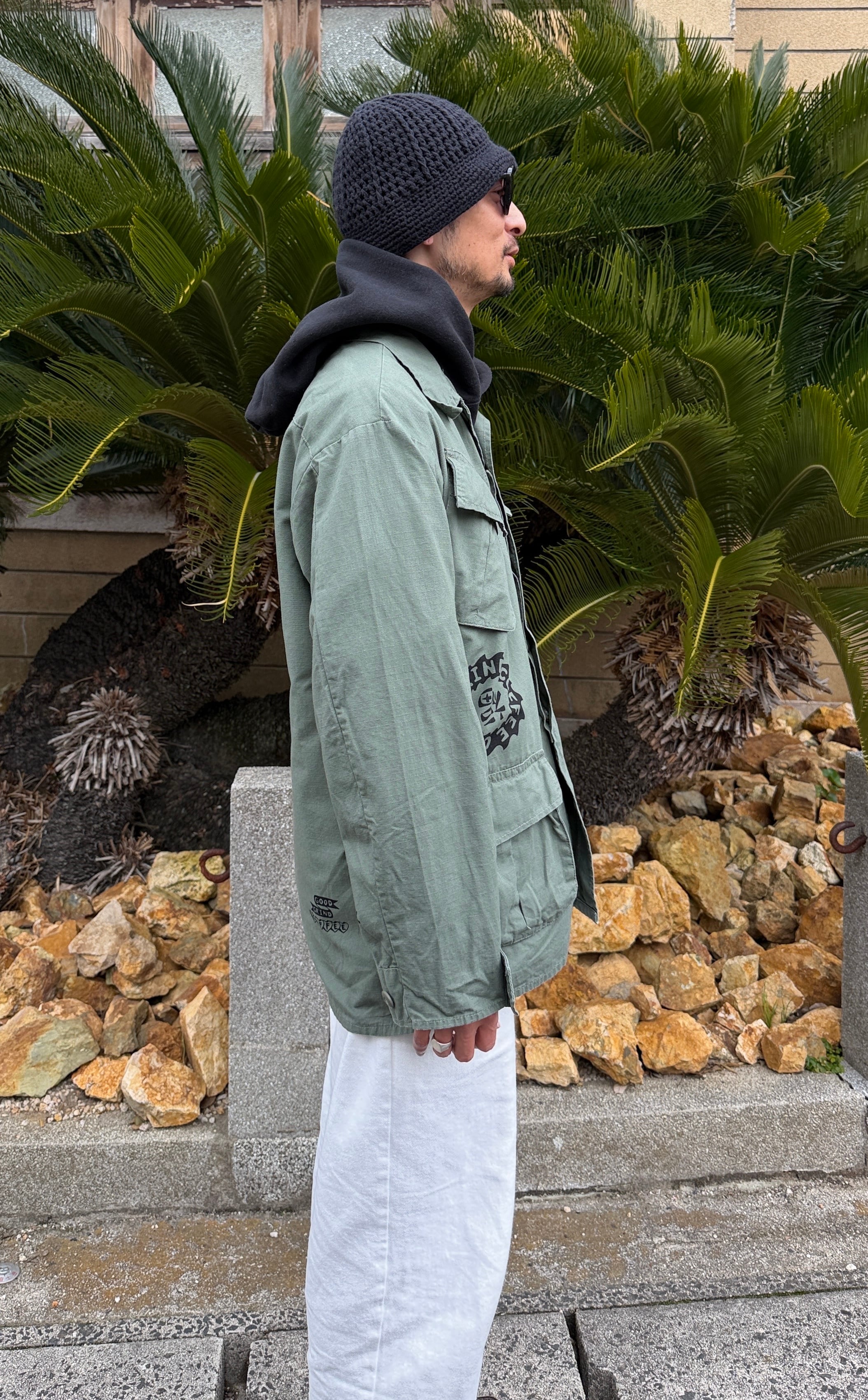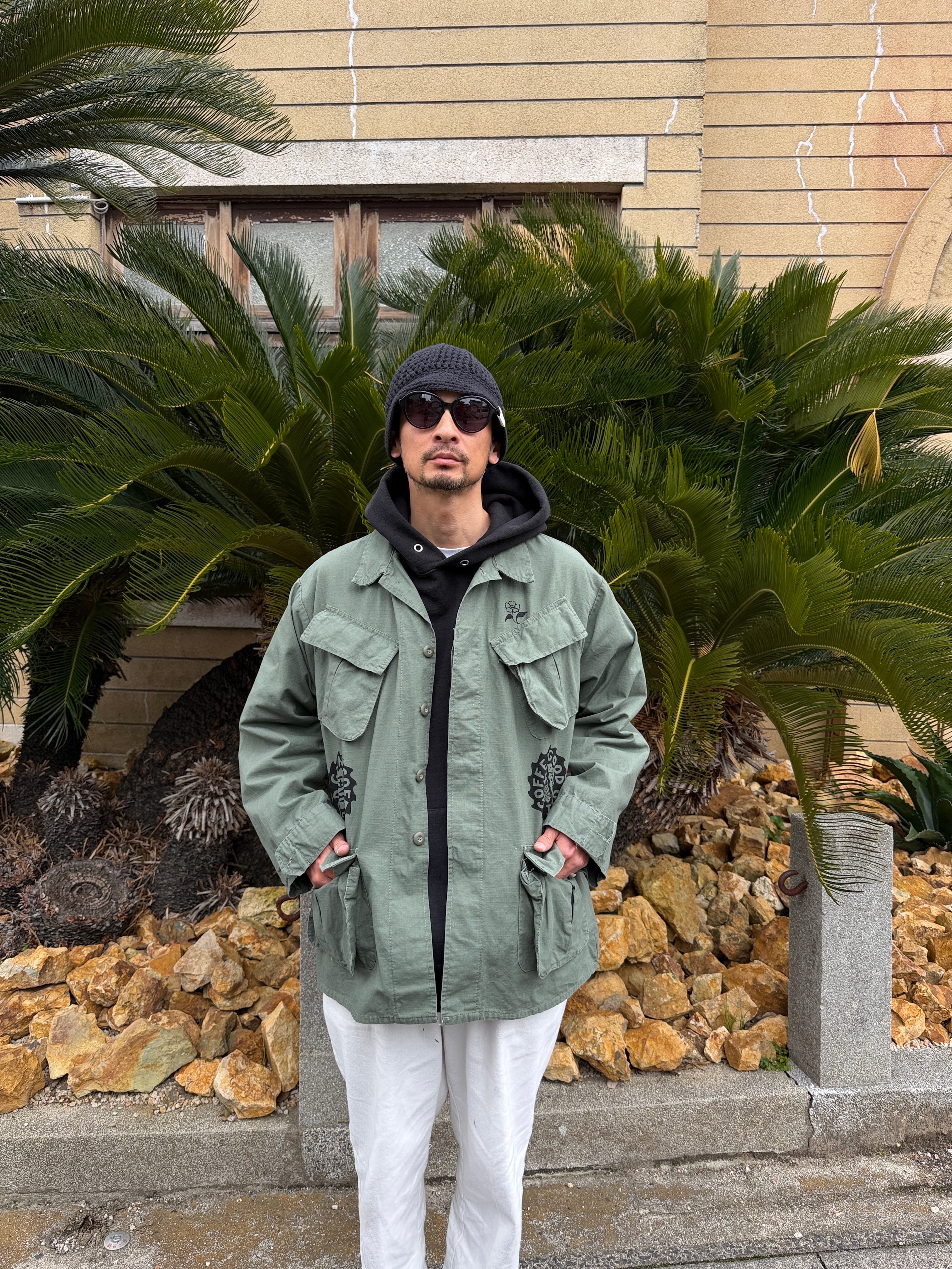 パーカーの上にも羽織れるゆとりのある作りになってます。TEEの上からももちろん羽織れるので初夏の夜まで使い回せるアイテムです。 ボディカラー olive プリントカラー BLACK 着丈78cm 身幅60cm 袖丈60cm 肩幅58cm 古着にプリントしていますので 古着にご理解の上でご購入お願いします レターパックプラスで発送になります