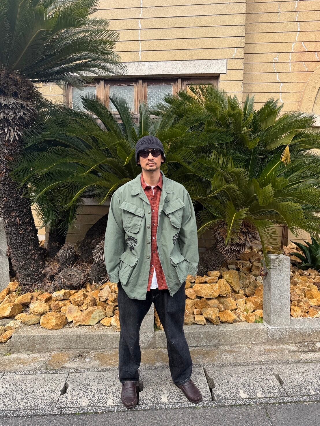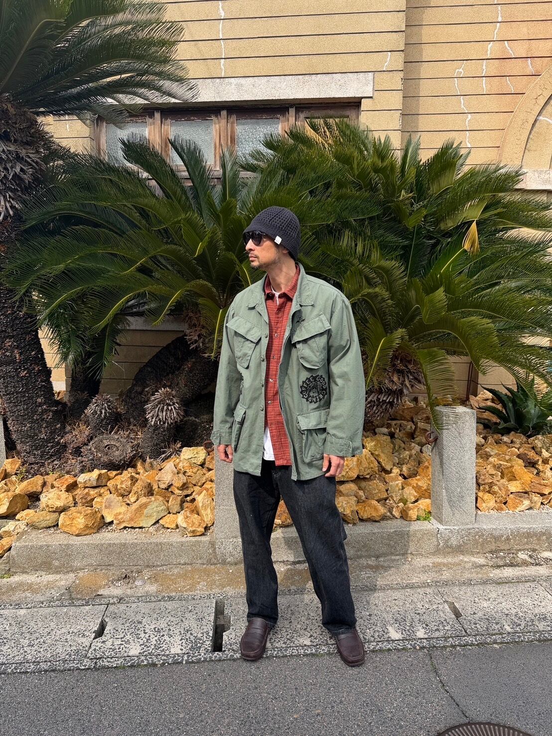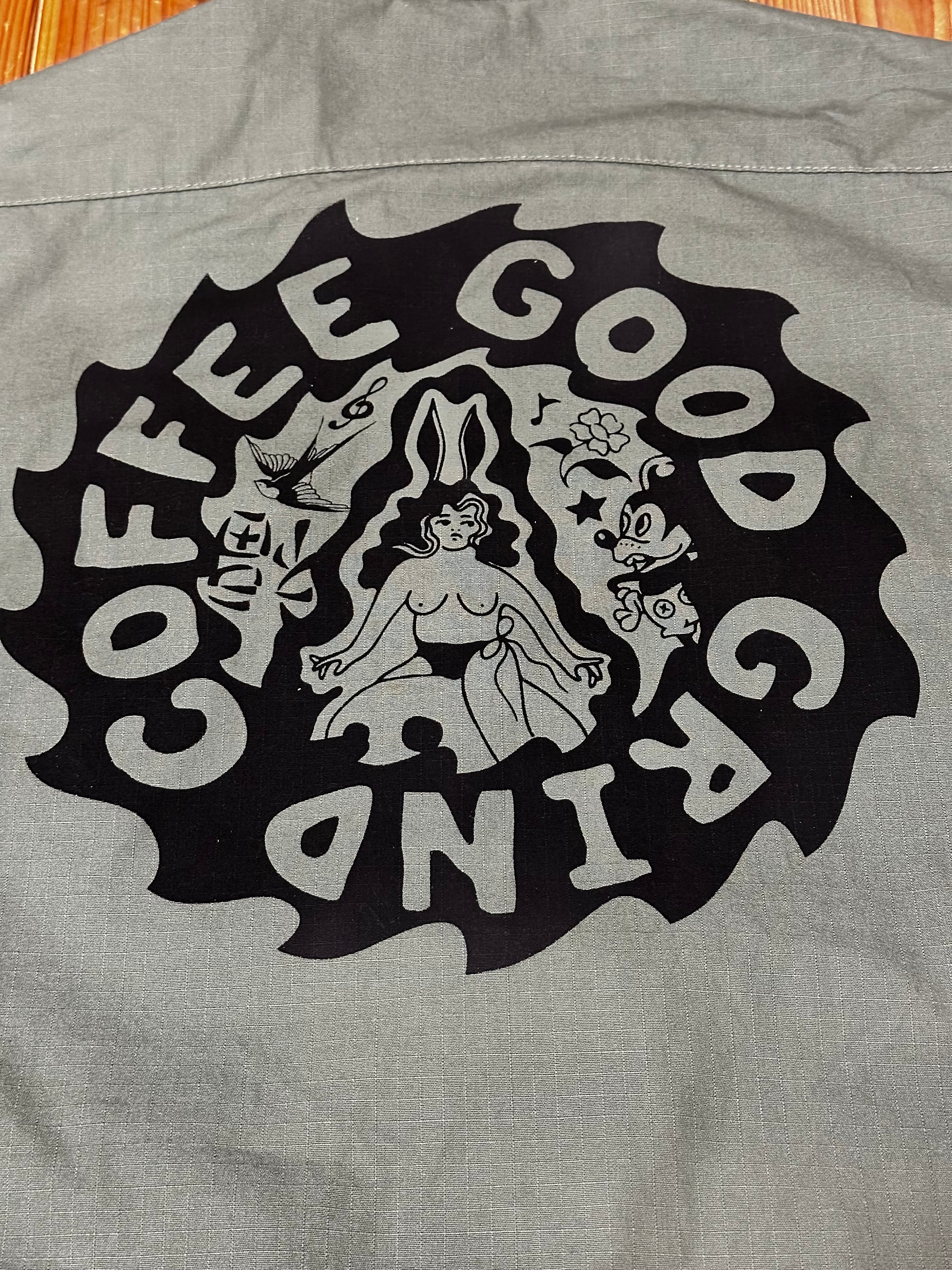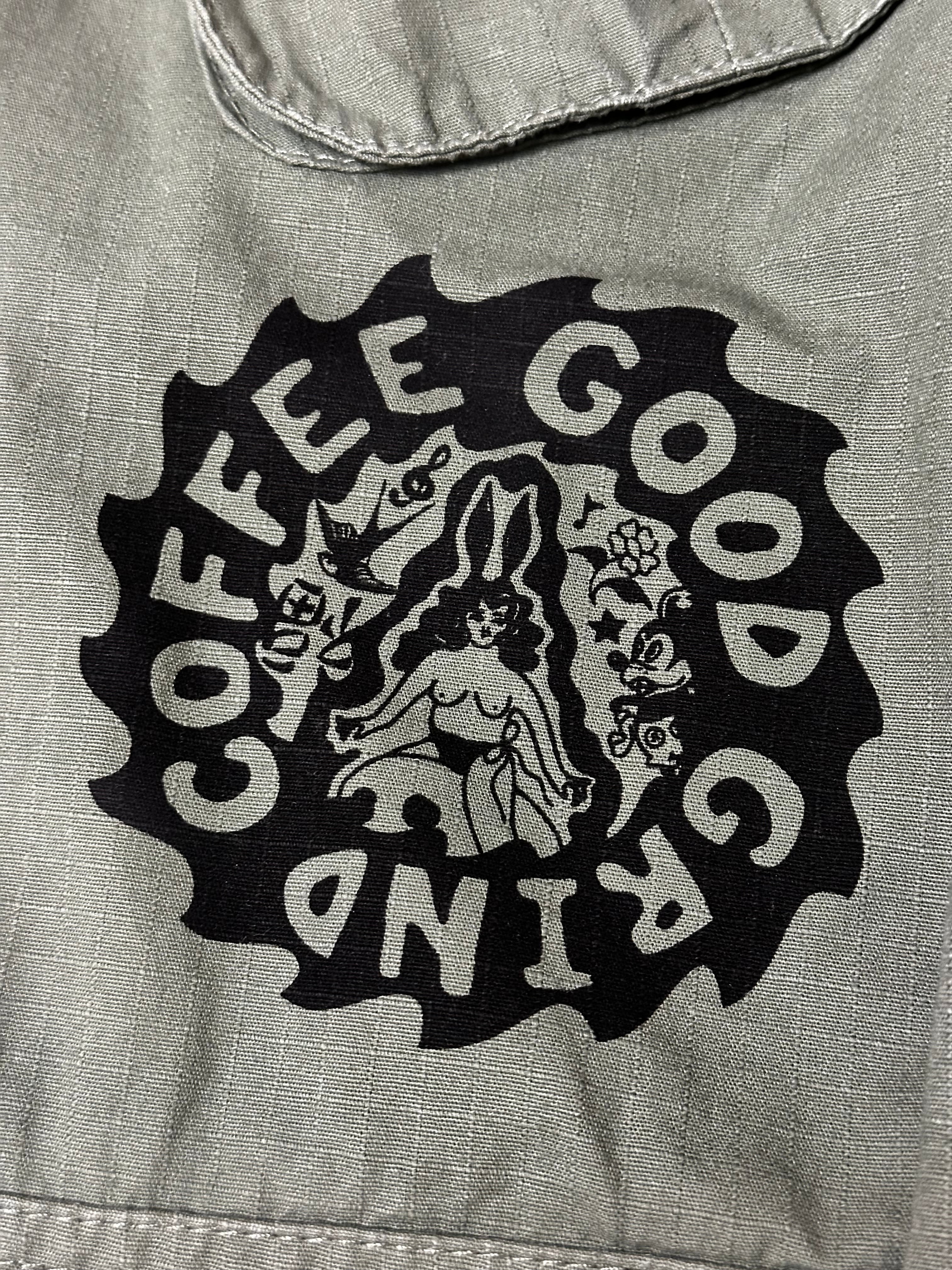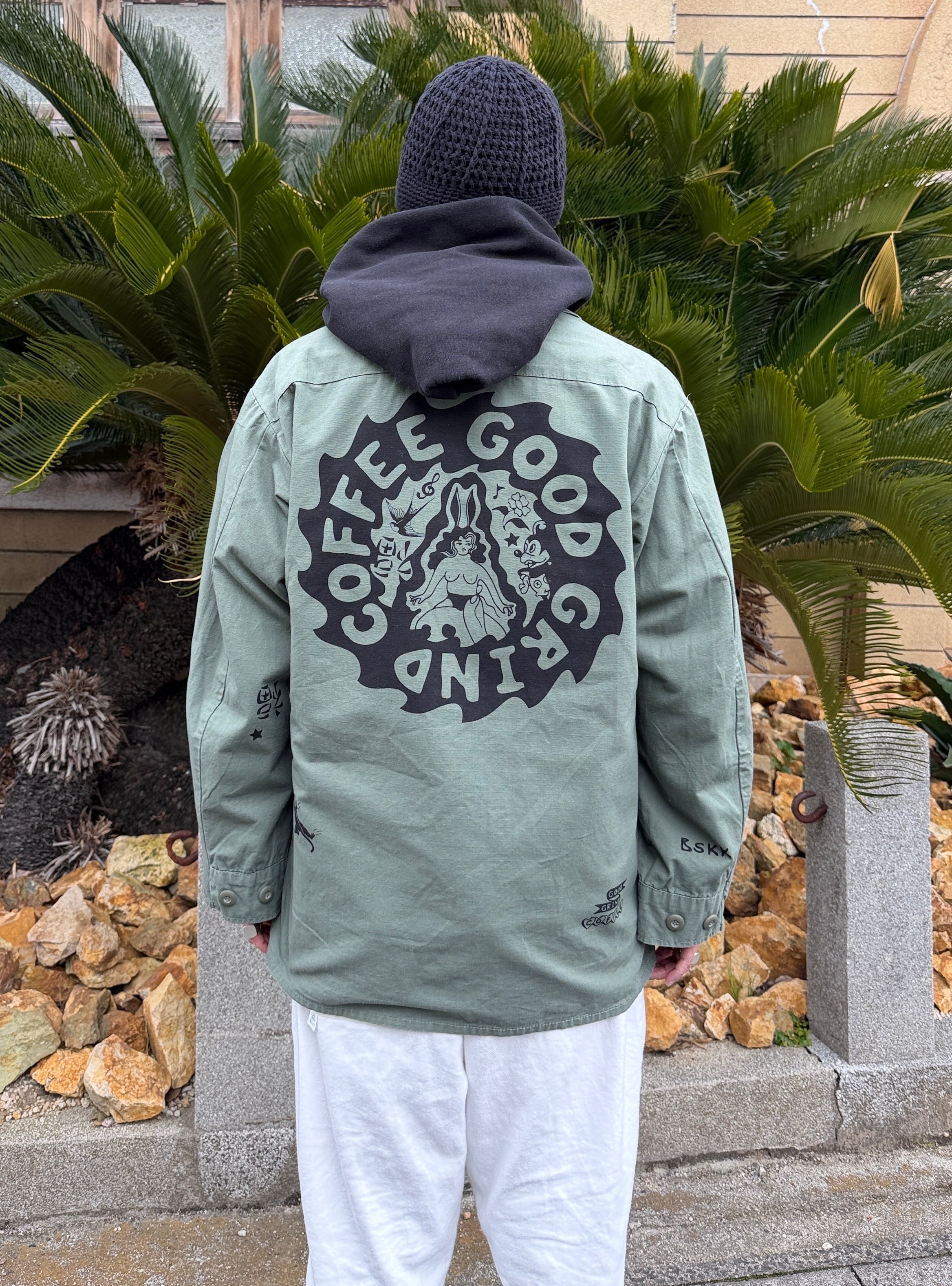 パーカーの上にも羽織れるゆとりのある作りになってます。TEEの上からももちろん羽織れるので初夏の夜まで使い回せるアイテムです。 ボディカラー olive プリントカラー BLACK 着丈78cm 身幅60cm 袖丈60cm 肩幅58cm 古着にプリントしていますので 古着にご理解の上でご購入お願いします レターパックプラスで発送になります