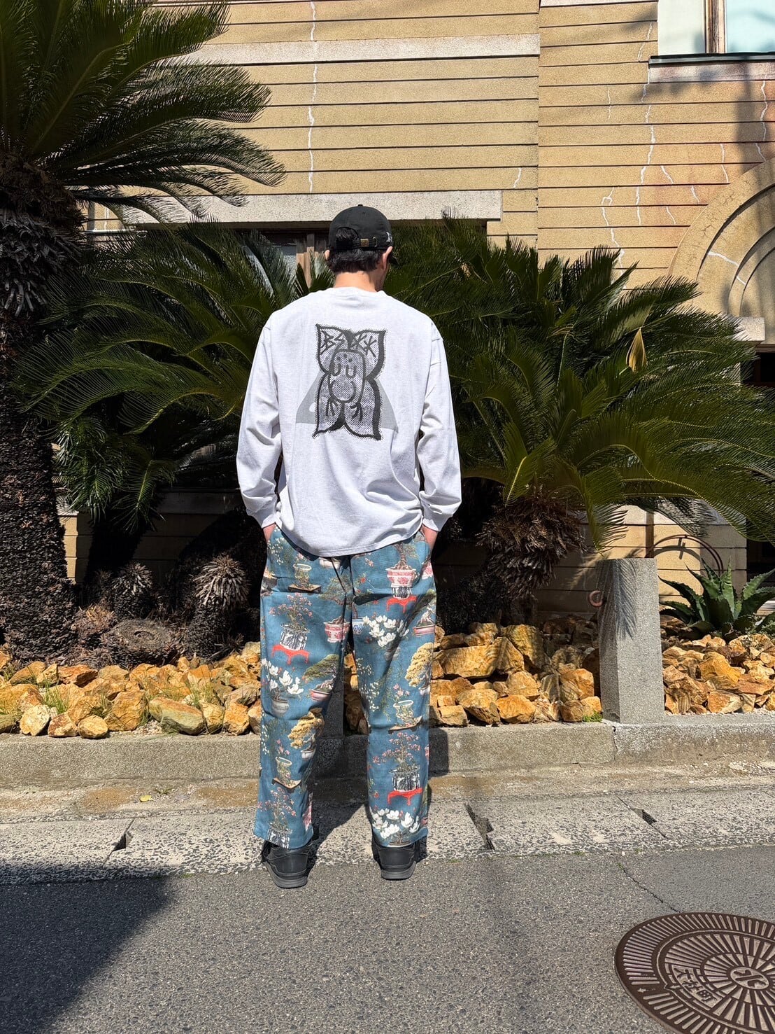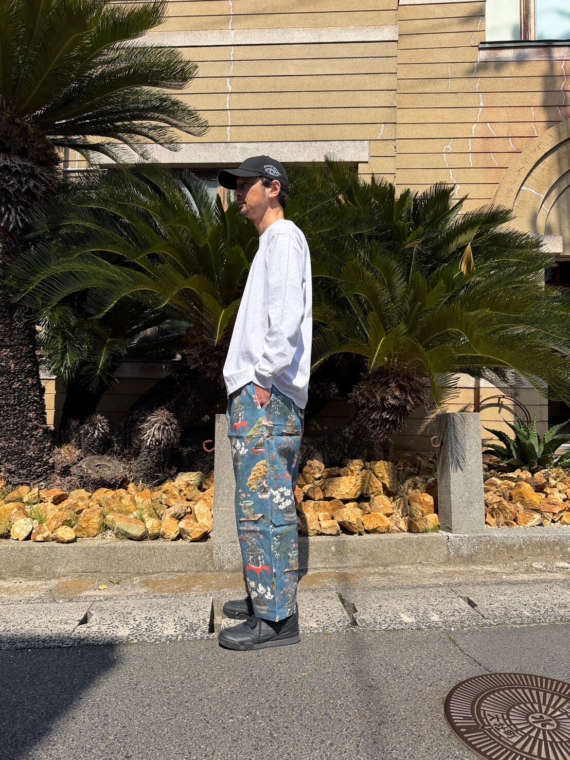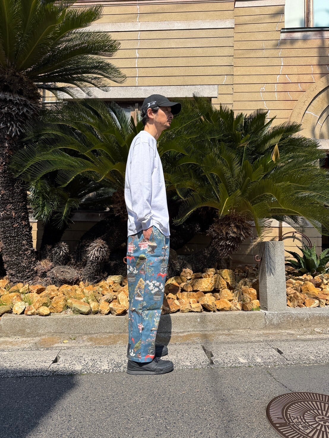 ご購入はおひとり様、1点まででお願いいたします。 SUNDAY PANTS初のヨーロッパの生地を使用した1本。 スペインのインテリアファブリックです。 THE NIPPONなクセの強い盆栽柄。 SIZE: waist 75cm ~ (ゴム入り) 股上 39cm 股下 59cm MATERIAL: COTTON SPANISH FABRIC USED
