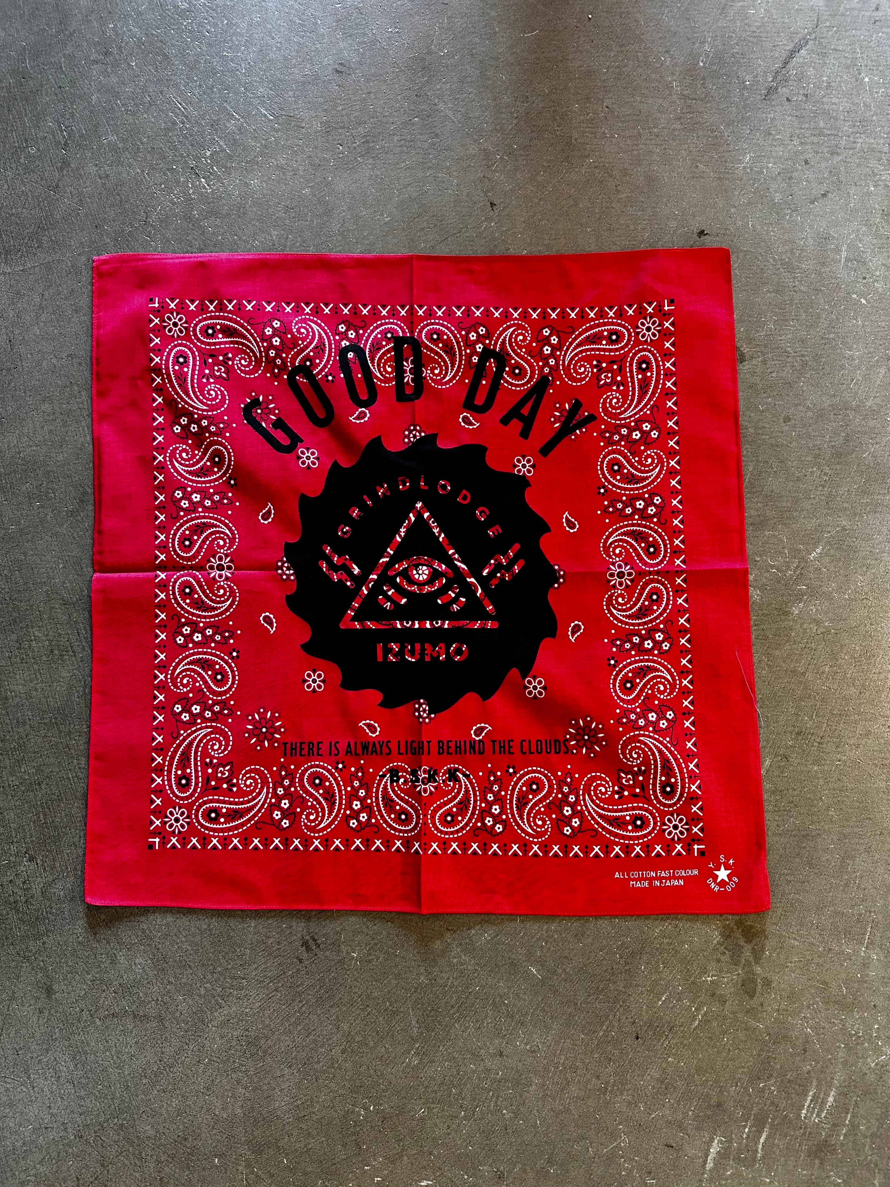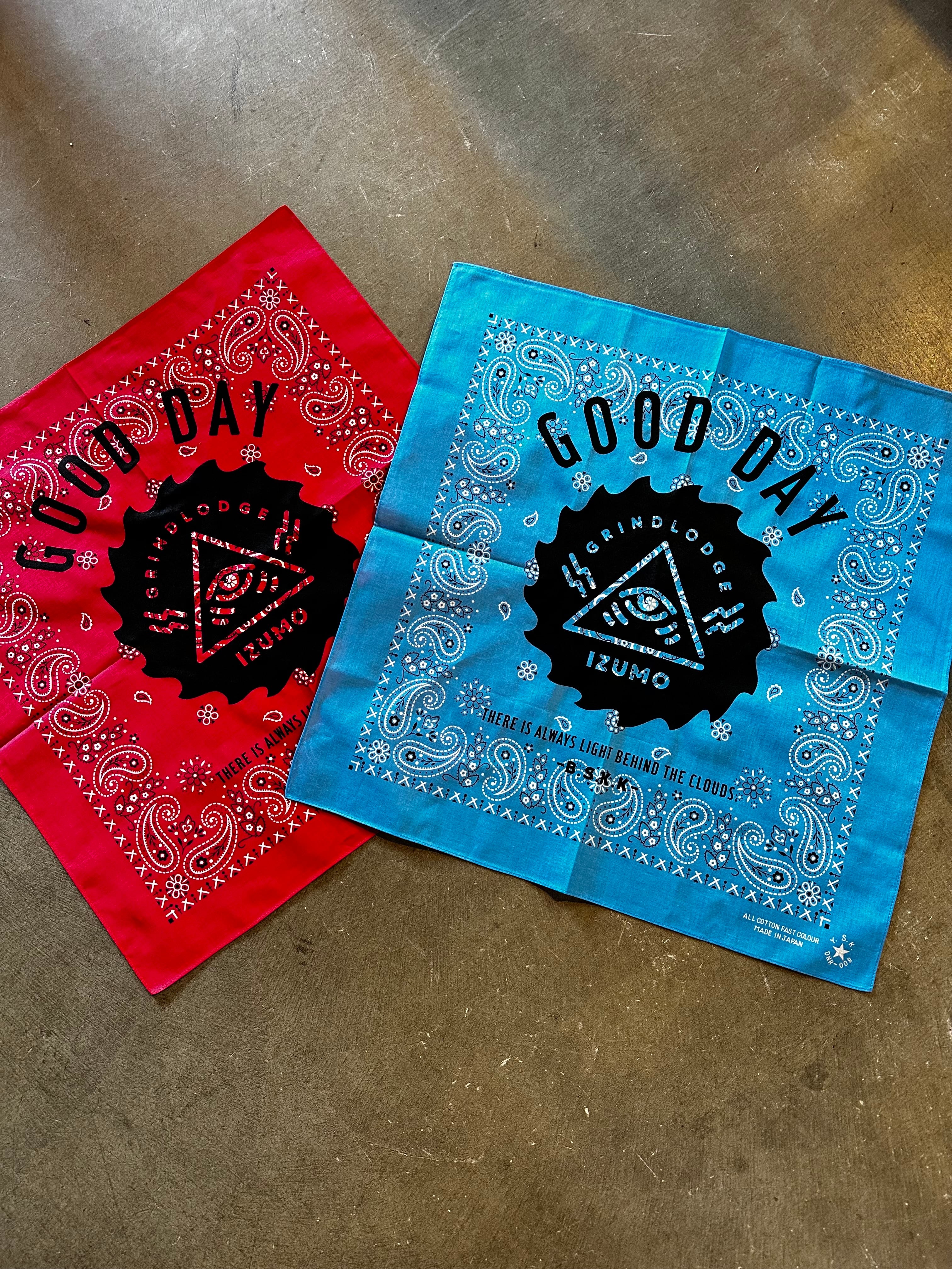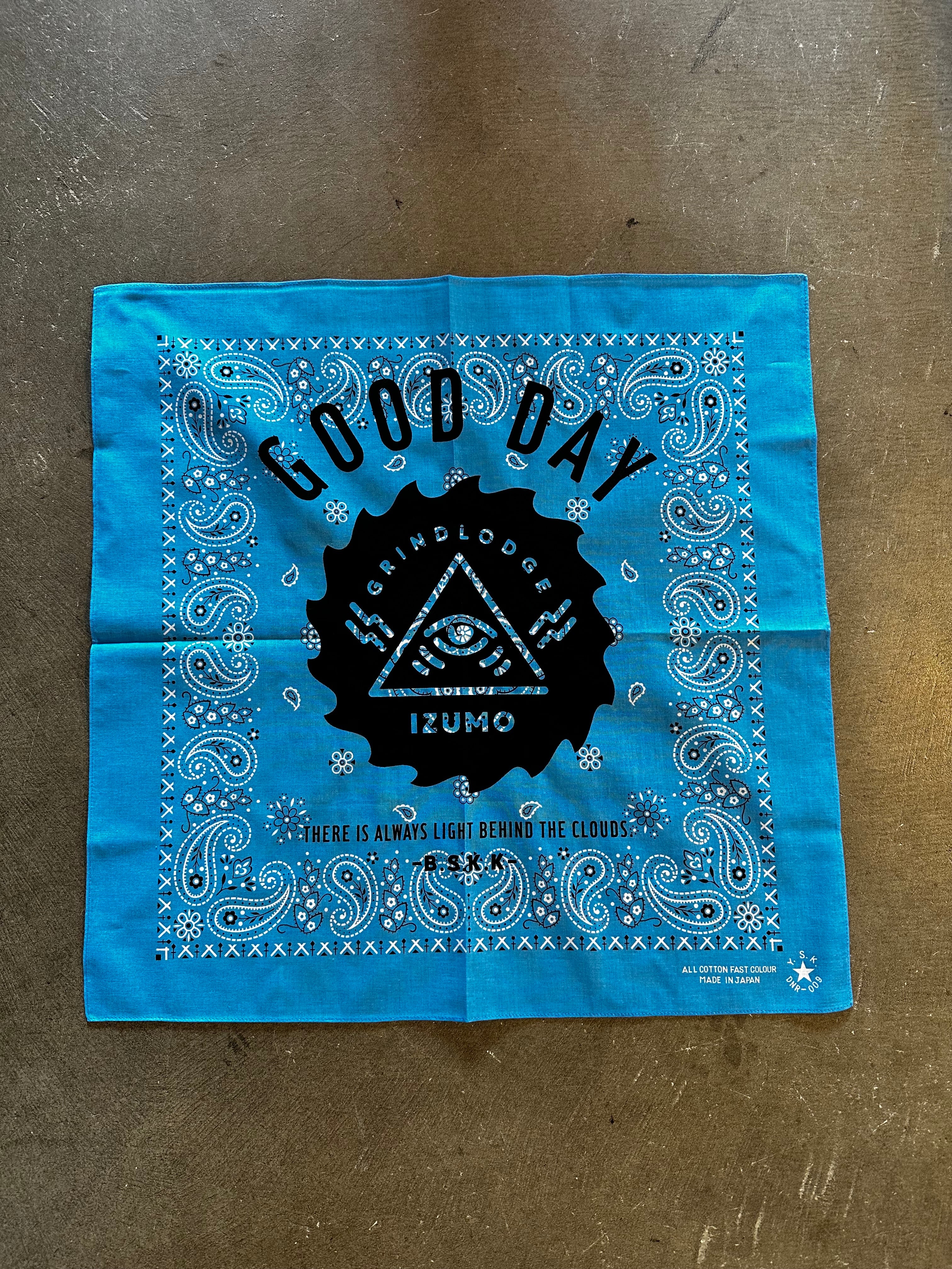 GOOD DAY をバンダナに落とし込んでみました!どう畳むと良いのかな?って色々と試してみてください! これからの季節にバンダナは役立ちますね。 53cm×53cm COTTON 100% MADE IN JAPAN スマートレターでの発送になります