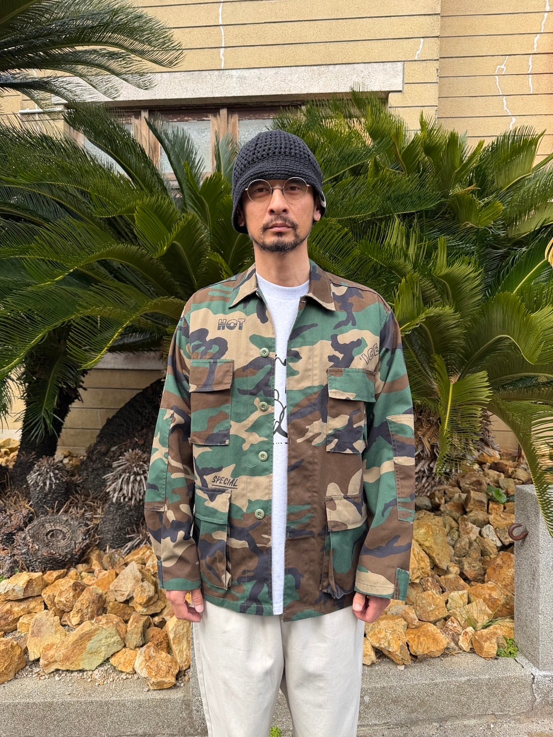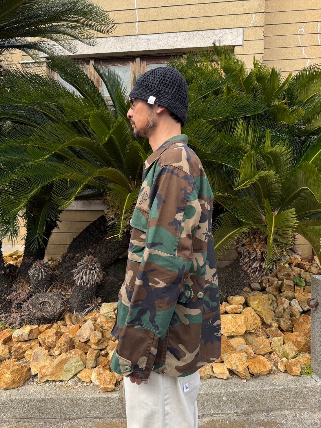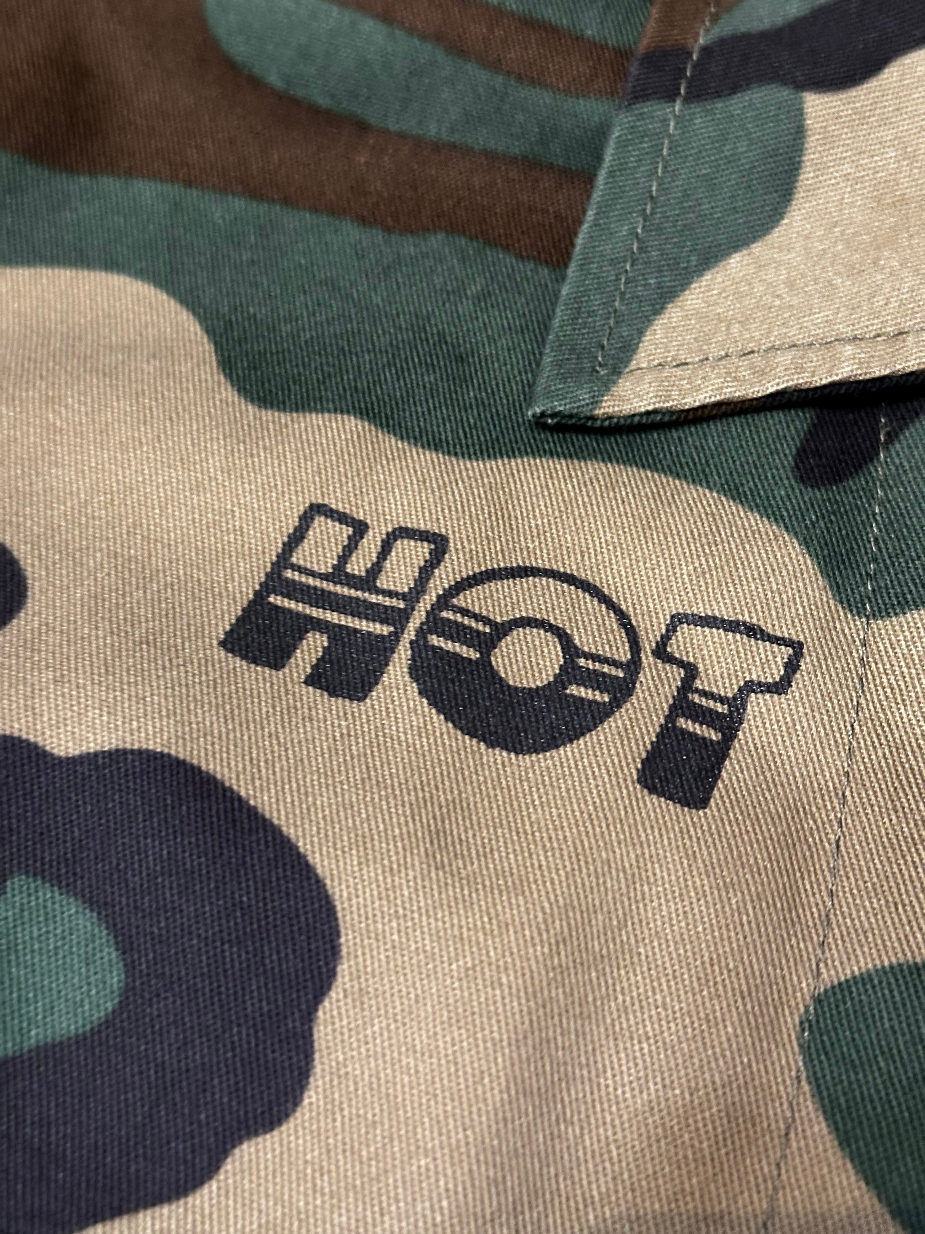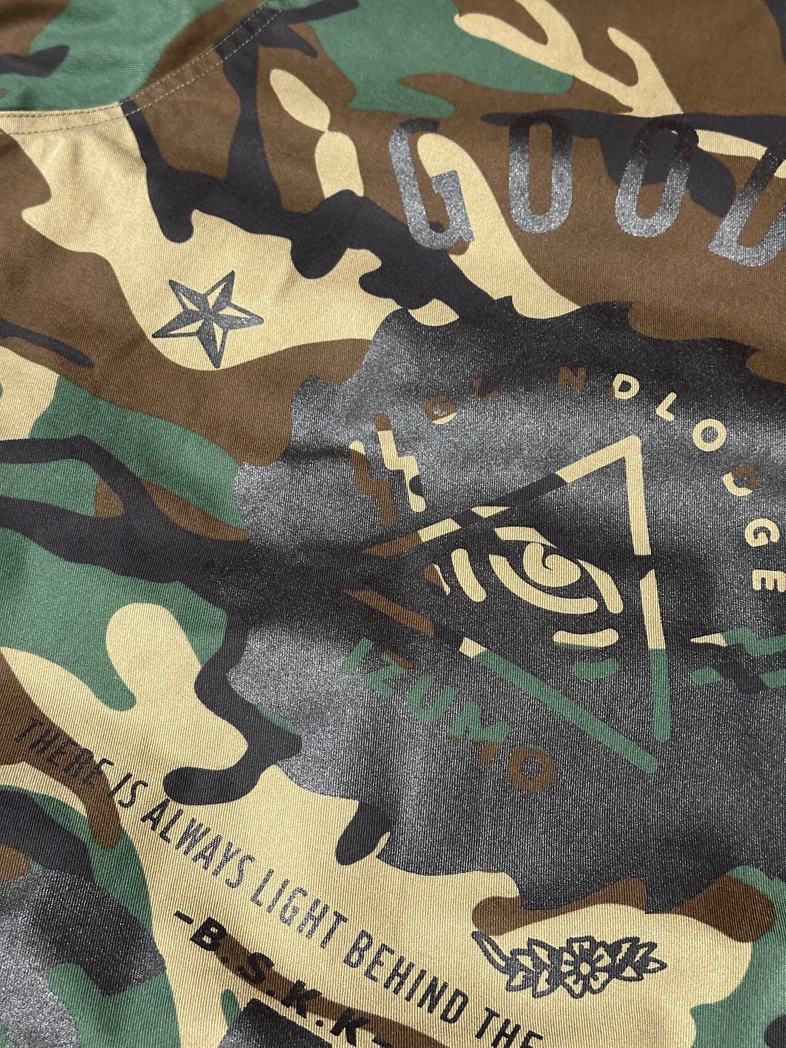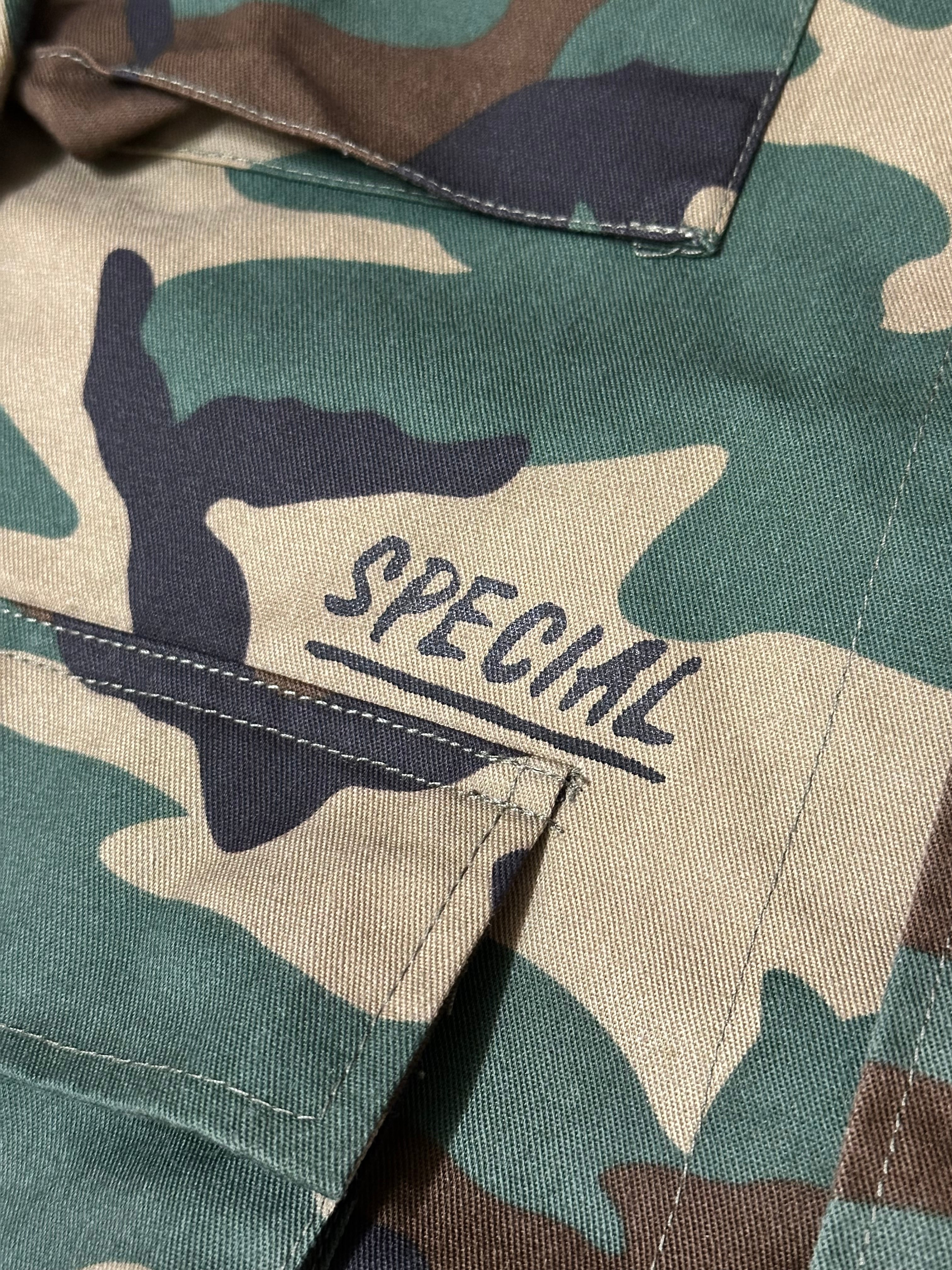 USのmilitary shirt JKTにランダムにプリントが施してあります。