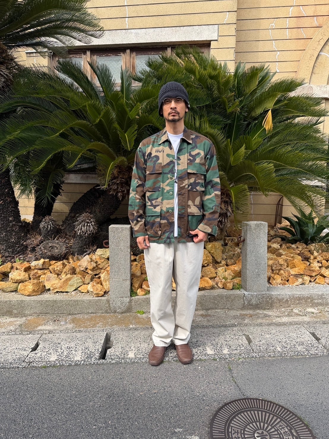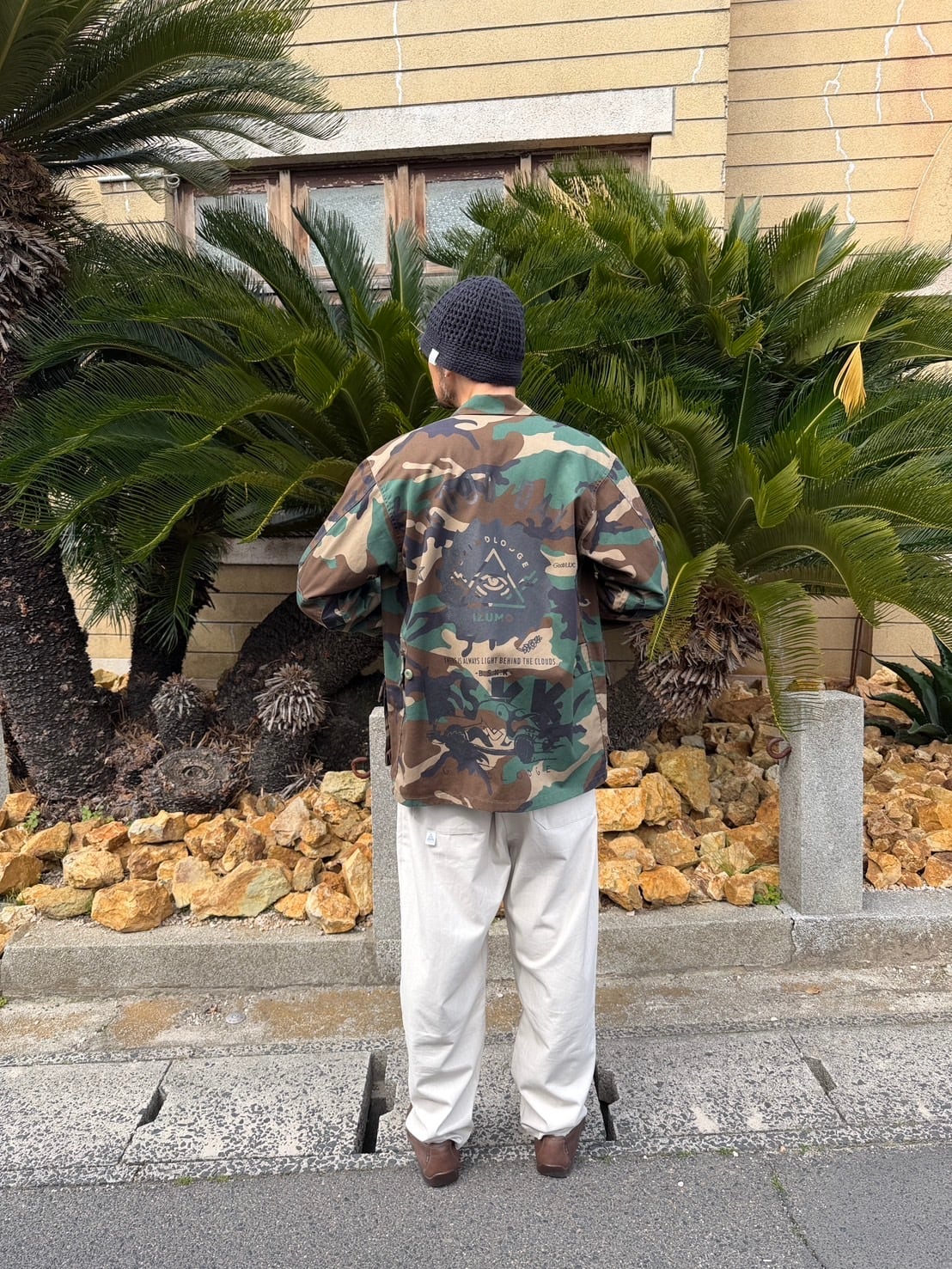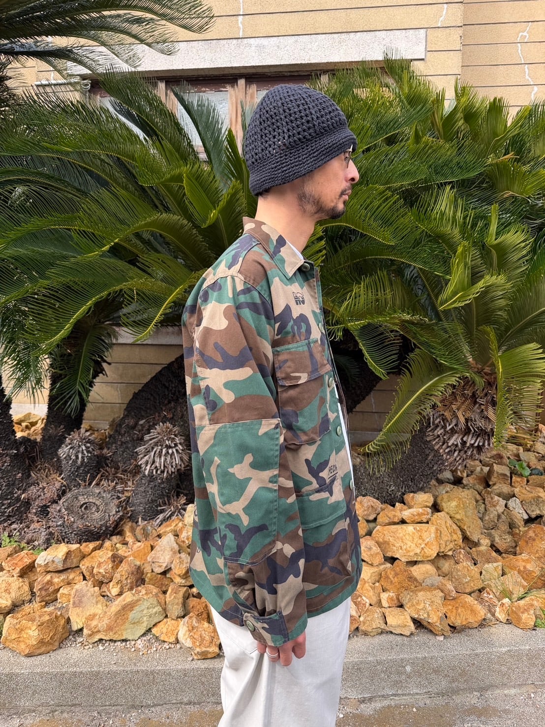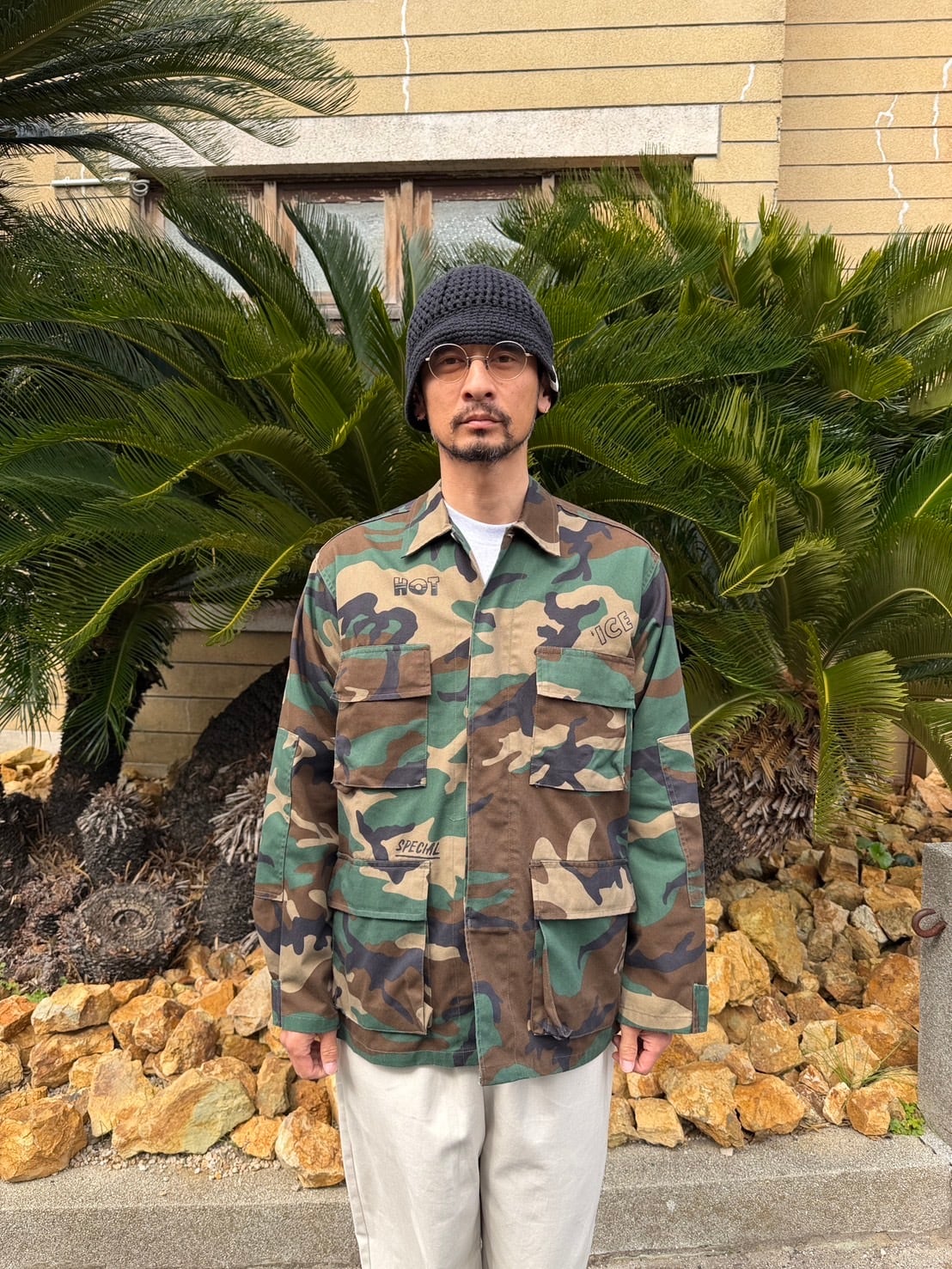 USのmilitary shirt JKTにランダムにプリントが施してあります。
