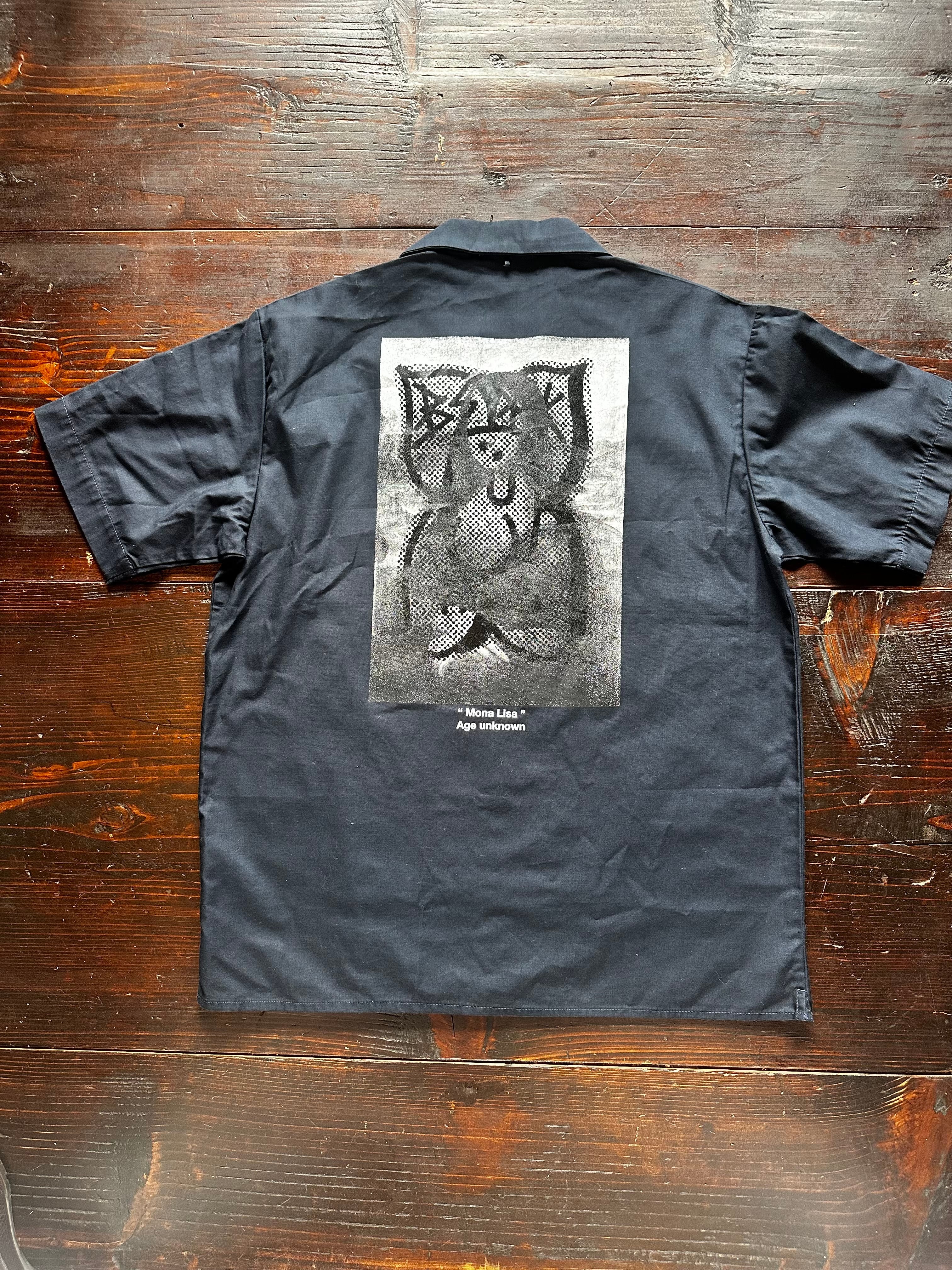 REPRO GALLERY製のMona Lisaのショートスリーブシャツにwoofoneのグラフィックを重ねてプリント。 着丈71cm 身幅56cm 肩幅52cm 袖丈24cm アームホール24cm 古着にプリントしてある為、古着にご理解の上でご購入お願いします。 レターパックライトで発送になります